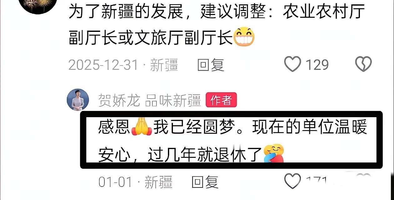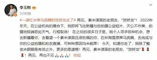 贺娇龙是土生土长疆二代,父母都是60年代支边知青,父亲四川射洪人,母亲是江苏人,贺娇龙曾回过回川认亲。 “火于马上,逝于马下,别于即将来临的马年” 。 贺局长今年才47岁,一直置身于宣传新疆,圈粉635万,多次从马背上跌落,这一次永远离开了! 母亲曾看过女儿从马背上摔落的视频,非常担心,严肃地告诉她不要再骑马了,不听话就别回家了。 这一次,贺娇龙再也没有办法回家了,妈妈的话一语成谶。 面对,白发人送黑发人,母亲该是多么伤心,多么绝望。 在新疆这片广阔的土地上,留下了贺娇龙驰骋骏马的飒爽身影。 她一头短发干净利落,气质优雅,看起来比实际年龄要年轻许多。 不久以前有粉丝给贺娇龙留言:“为了新疆的发展,建议调整升职为农业农村厅副厅长或文旅厅副厅长。” 贺娇龙真诚的回复留言:“感恩!我已经圆梦。现在的单位温暖安心,过几年就退休了。” 她也期盼退休,她为新疆的发展,做出了贡献,下基层,踏马背,踩积雪。 去看伊犁,去看昭苏,成为了很多人的毕生梦想。 歌手李玉刚与贺娇龙未曾谋面,却整夜未眠,眼角有泪,发文悼念。 愿贺局长一路走好!