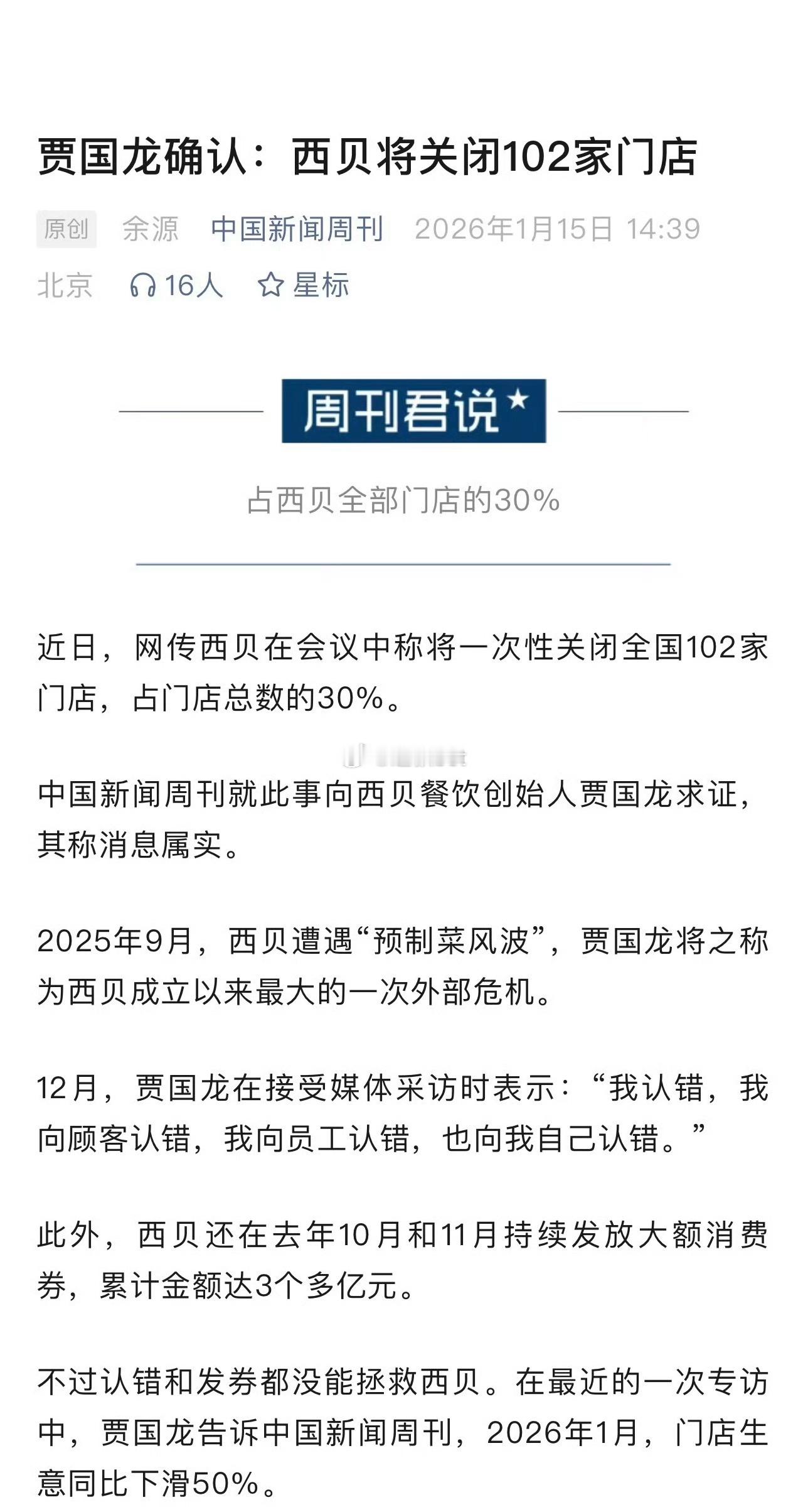 贾国龙确认:西贝将关闭102家门店,预计将有4000名员工失业下岗。早点认错,可能也不至于此,带孩子的家长们被蒙在鼓里这么久,信任危机了吧!西贝将关闭102家门店