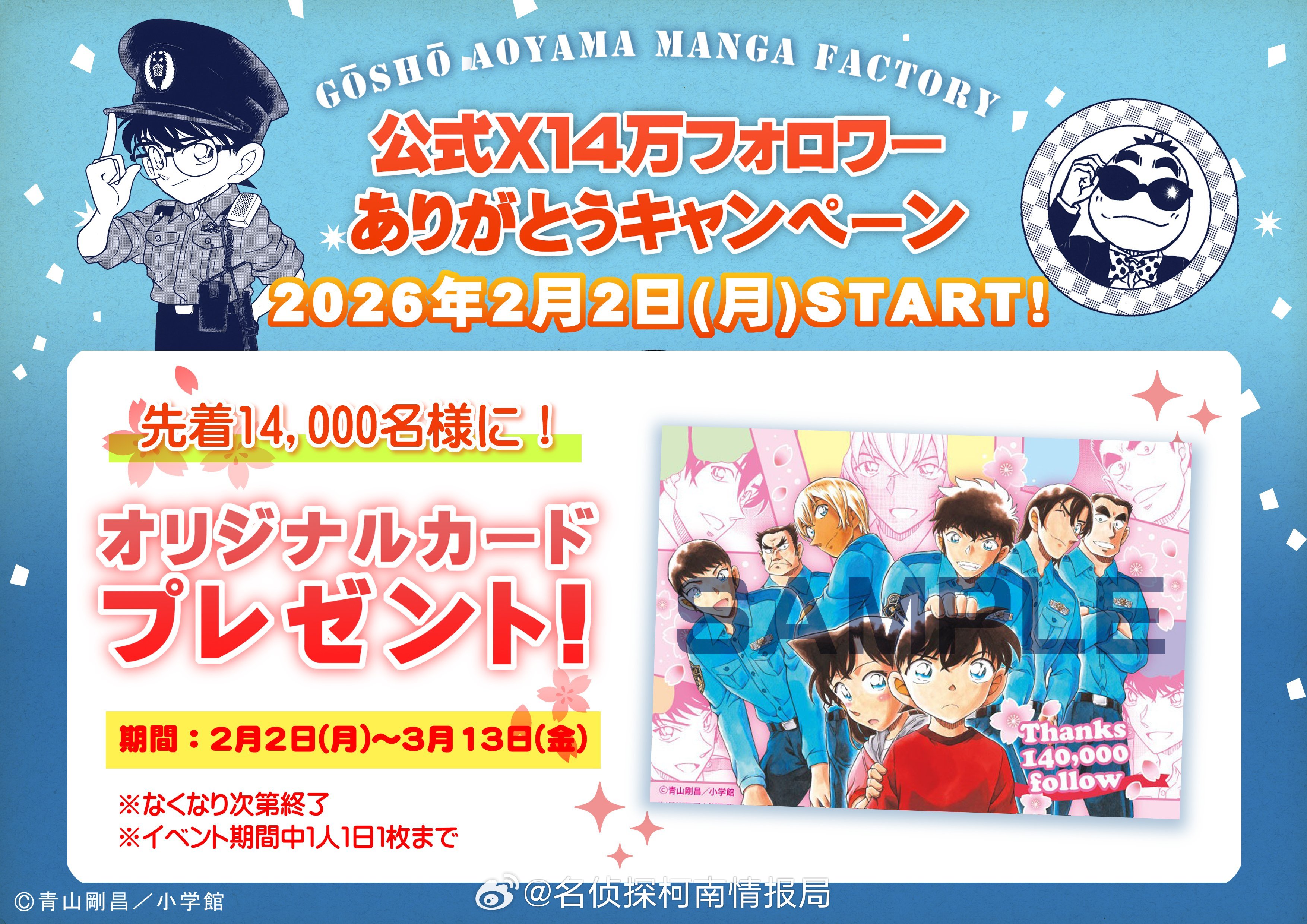 青山刚昌故乡馆回馈粉丝福利!2026年2月2日至3月13日,前14000名入馆游客可免费领取柯南主题原创限定卡片,每人每日限领1张,送完即止。此次推出的限定卡片印有幼年新一小兰和警校五人组,是青山刚昌故乡馆为粉丝专属定制的收藏周边!名侦探柯南