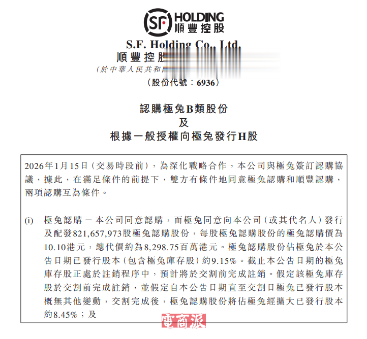 根据协议,双方将互为对方增发新股,顺丰向极兔增发2.26亿股H股,极兔则向顺丰增发8.22亿股B类股份。交易完成后,顺丰将持有极兔10%的股份,极兔则持有顺丰4.29%的股份。