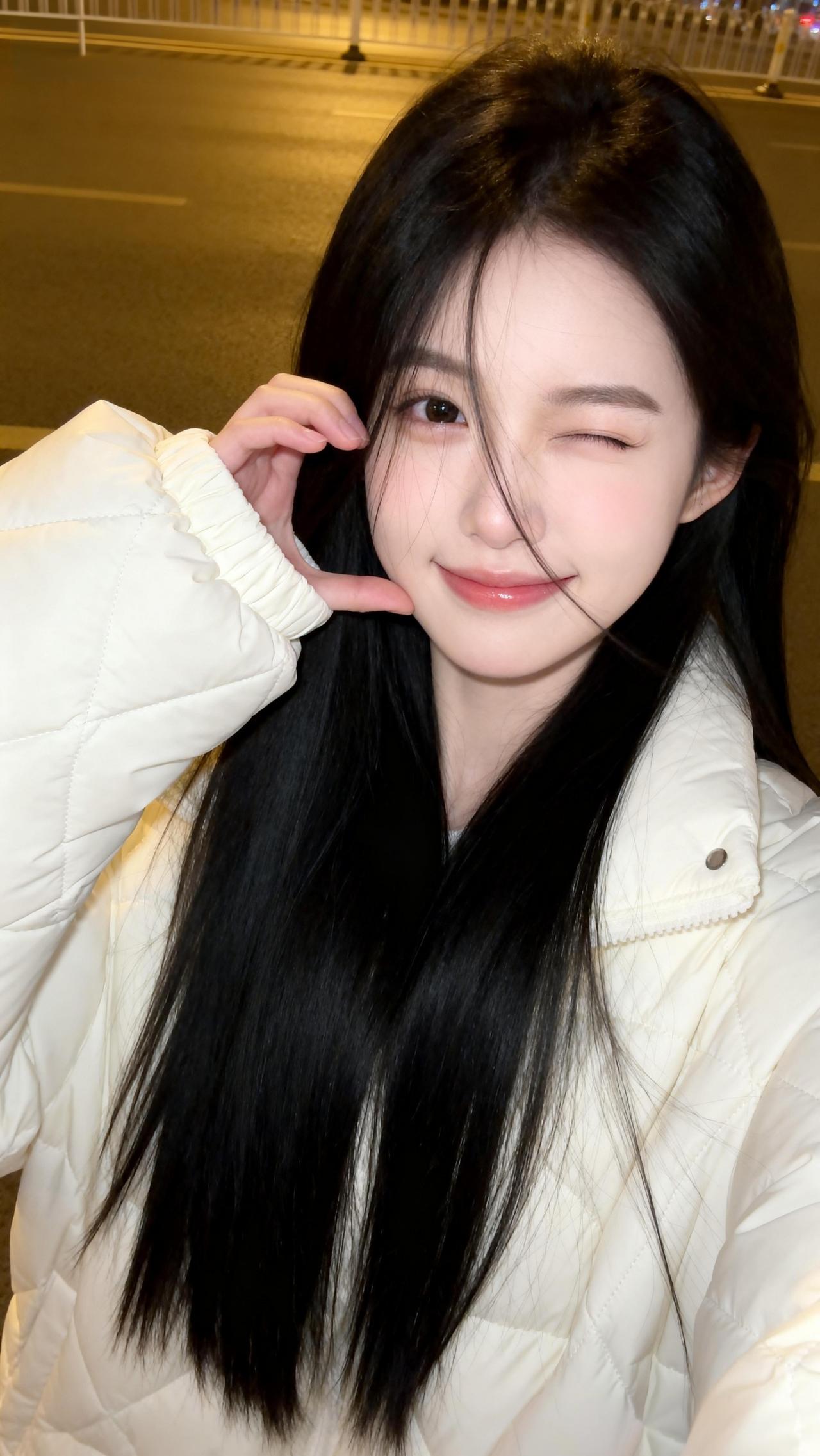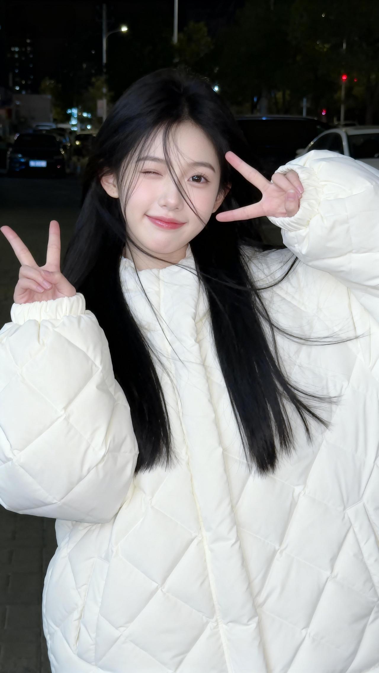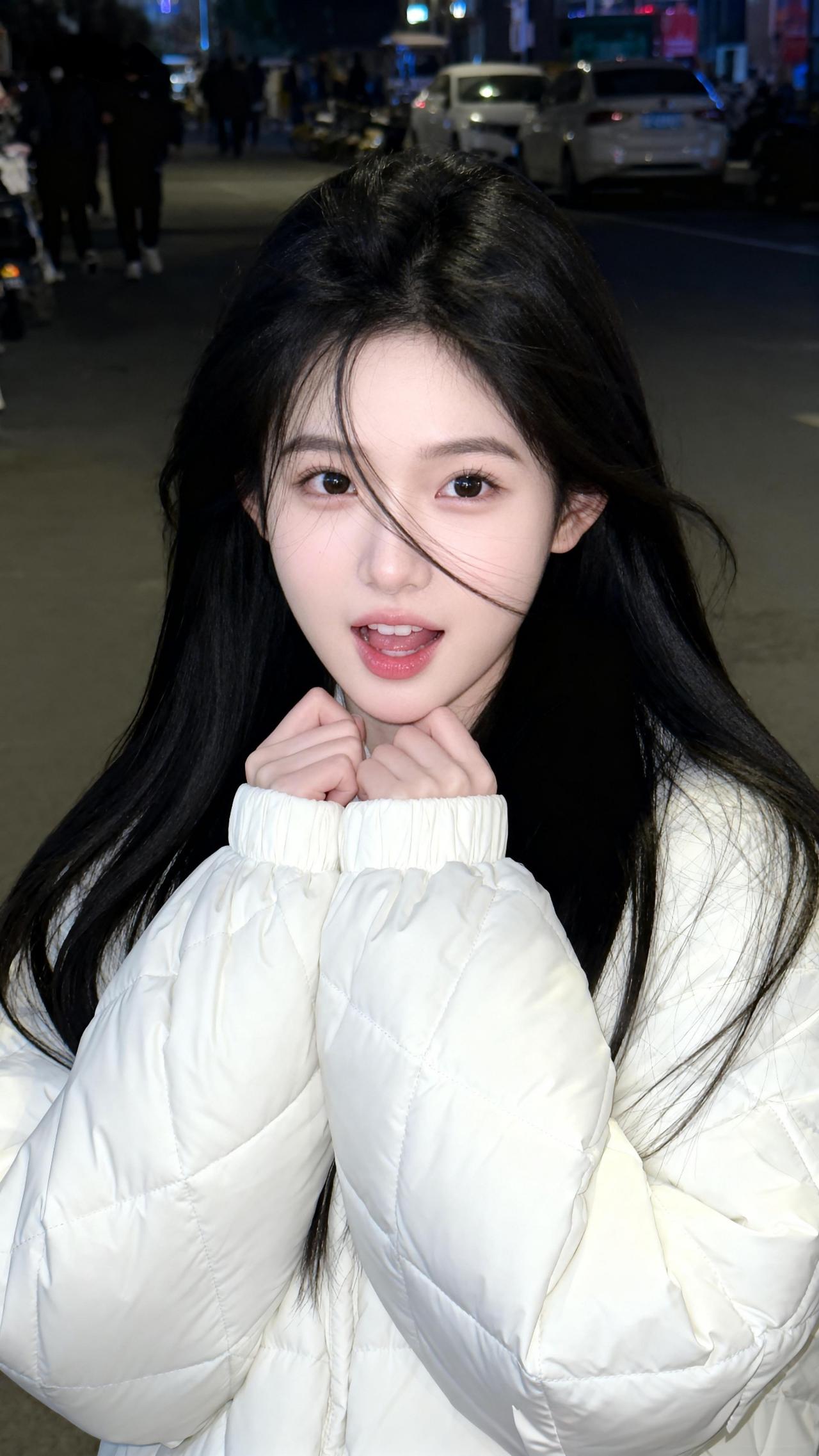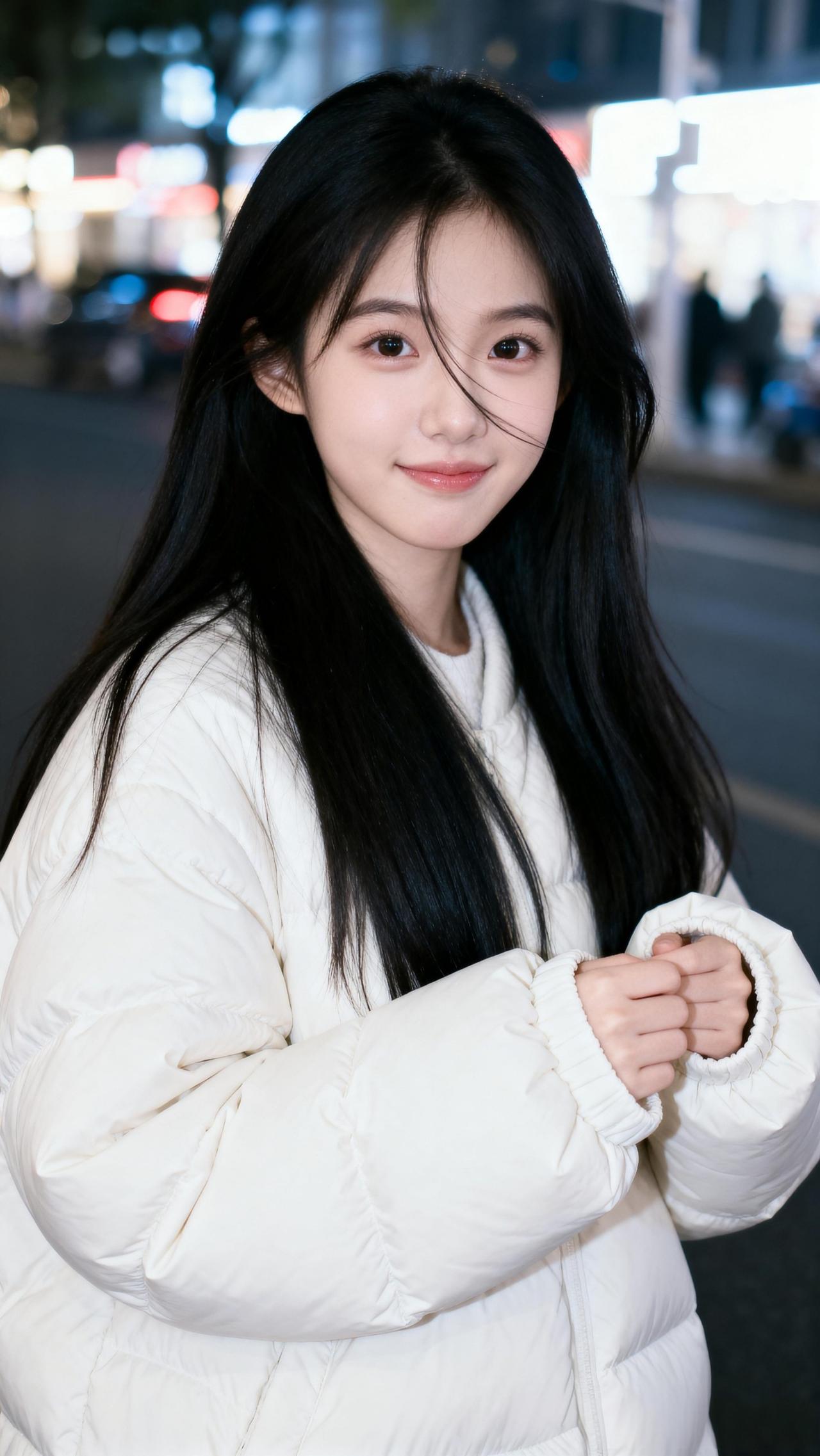夜晚街头的温柔少女,白色羽绒服搭配黑色长发,温暖而迷人。韩版白色羽绒服 温柔风羽