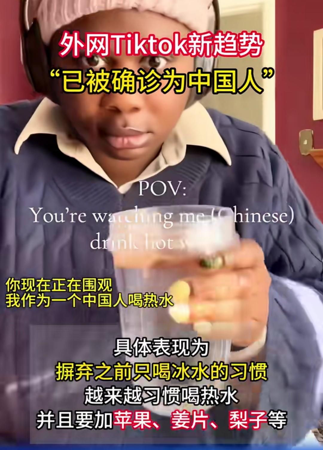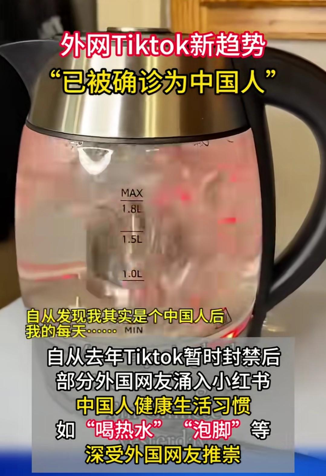 外网的tiktok有不少外国人学着中国人的生活习惯,说自己已经确诊为中国人。 摒弃之前喝冰水的习惯,学着中国人喝热水,并且还学会了在里面放姜片、苹果、梨等。 还学会泡脚,学会自己动手做饭。 还真是当国家强大了之后,做什么都有人学。