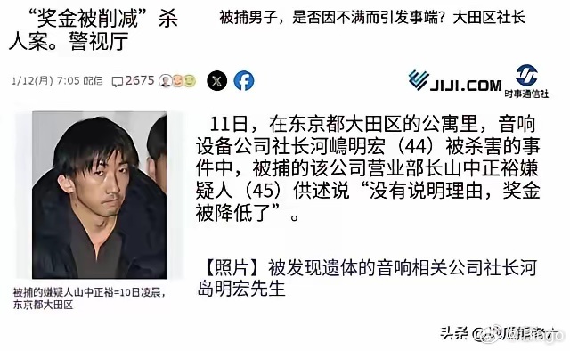 日本男子嫌年终奖发得少把老板杀了转给自己老板看