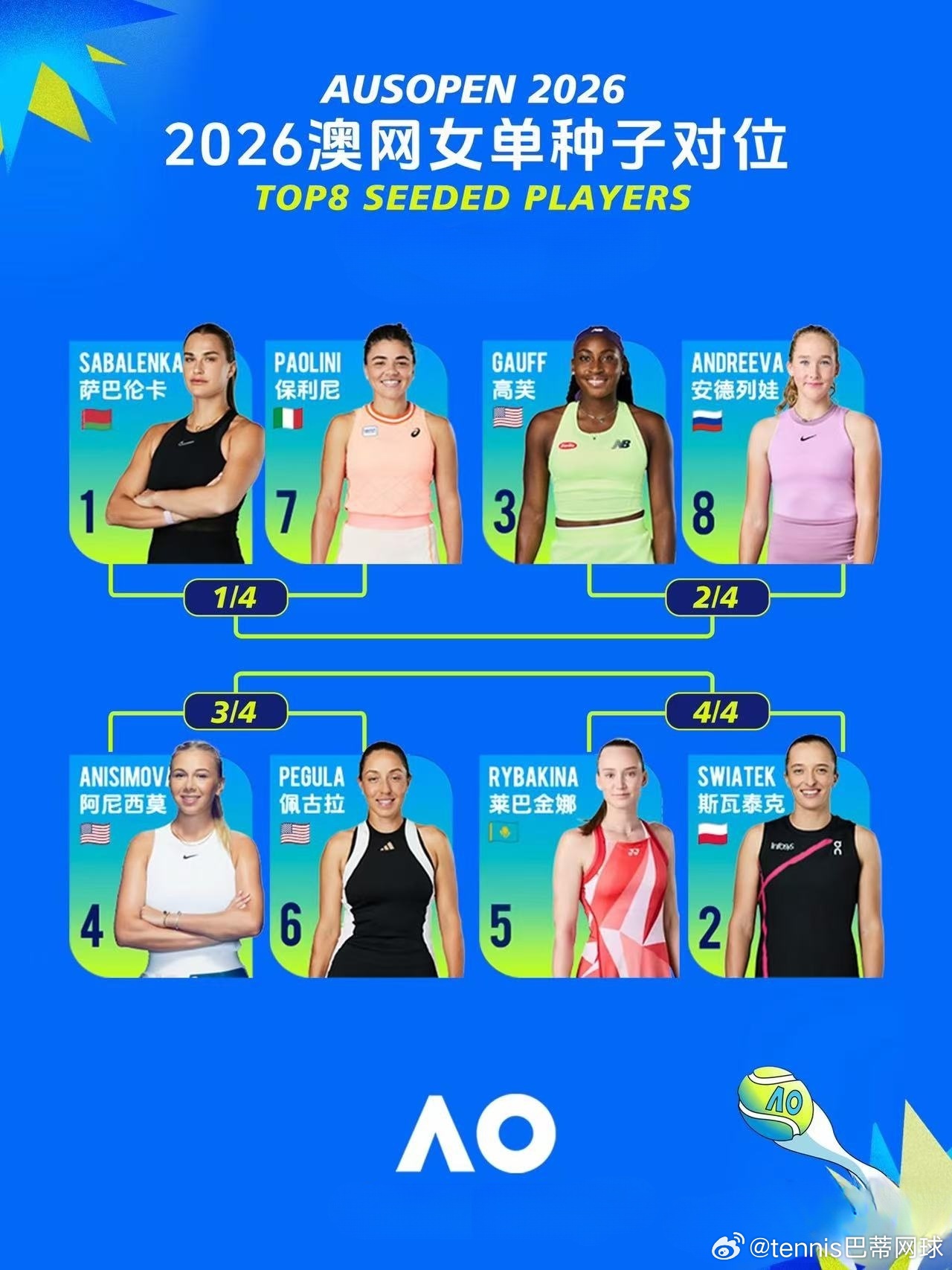 澳网女单前10号种子首轮对位🇧🇾 萨巴伦卡 vs. Rakotomanga Rajaonah 🇫🇷🇵🇱斯瓦泰克vs资格赛球员🇺🇸高夫vs拉希莫娃🇺🇿🇺🇸阿尼西莫娃vs沃尔特🇨🇭🇰🇿 莱巴金娜vs尤万🇺🇸佩古拉vs扎哈罗娃🇷🇺🇮🇹 保利尼vs资格赛球员🇷🇺安德烈耶娃vs维基奇🇭🇷🇺🇸 凯斯vs.Oliynykova 🇺🇦🇨🇭本西奇vs博尔特🇬🇧好多场都很有看点哦澳网抽签仪式澳网2026wta