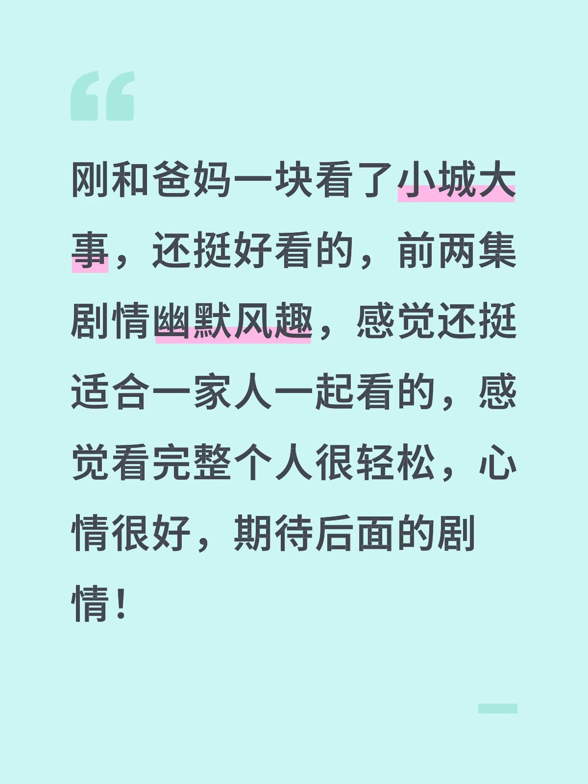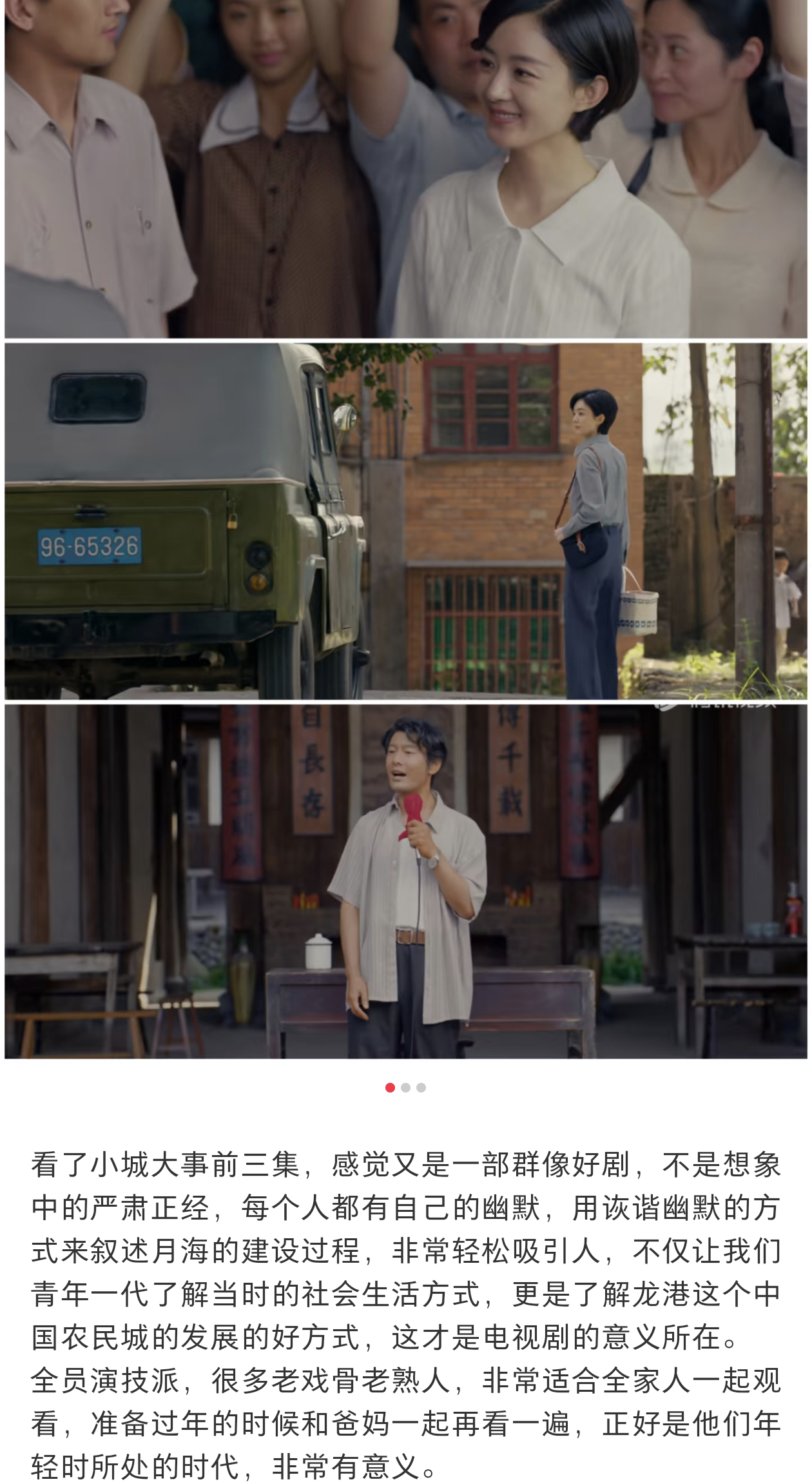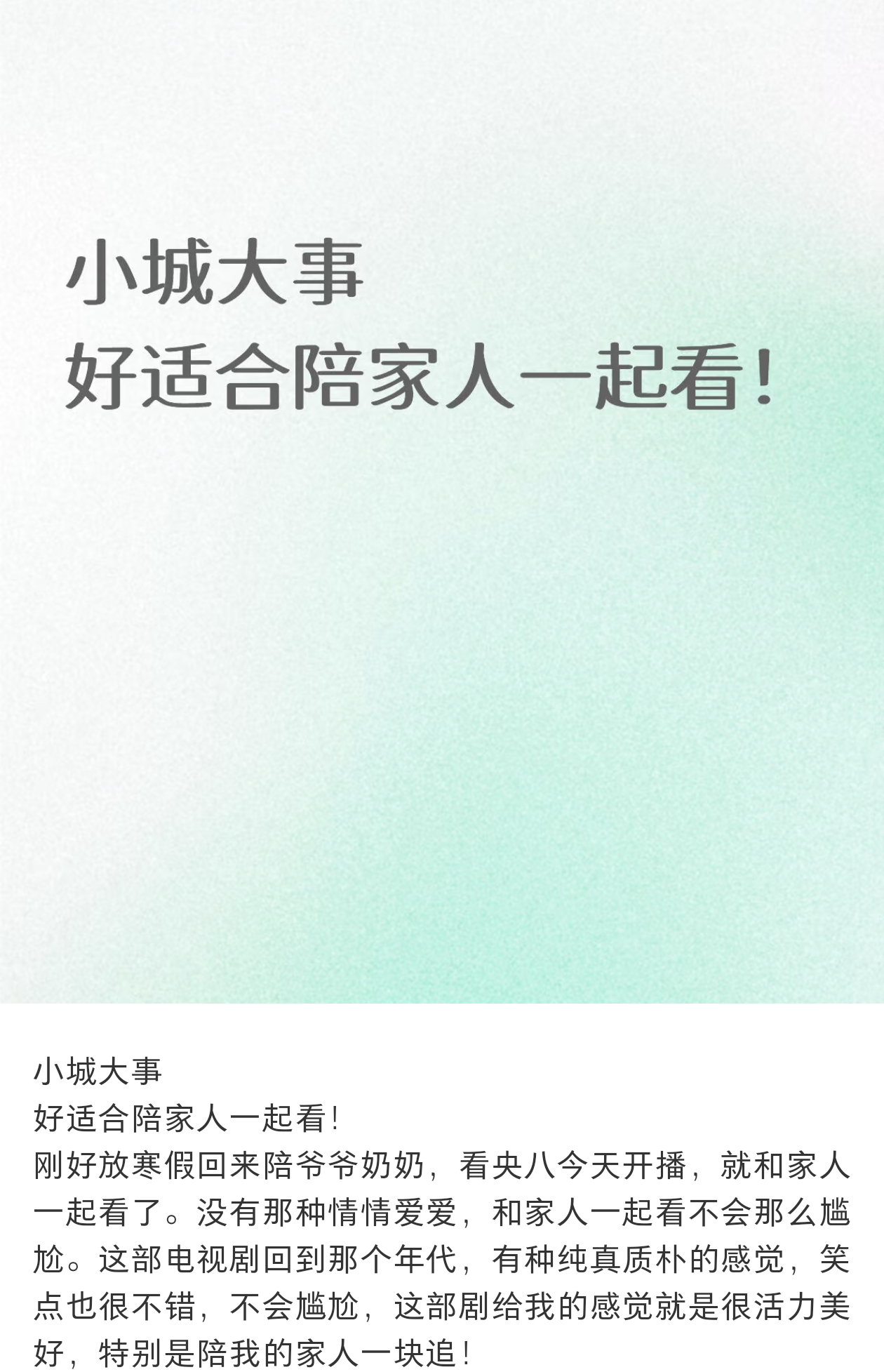 放假回家和长辈的共同话题有了 《小城大事》这部剧神奇地打破了我们家的“代沟结界”。以前和长辈聊天总停留在“吃饭了吗”“工作忙不忙”,现在能聊滩涂变新城的奋斗史,能聊80年代质朴的爱情观,能聊邻里间那种如今罕有的亲密。话题一打开,才发现他们心里装着那么多动人的往事和智慧。 小城大事