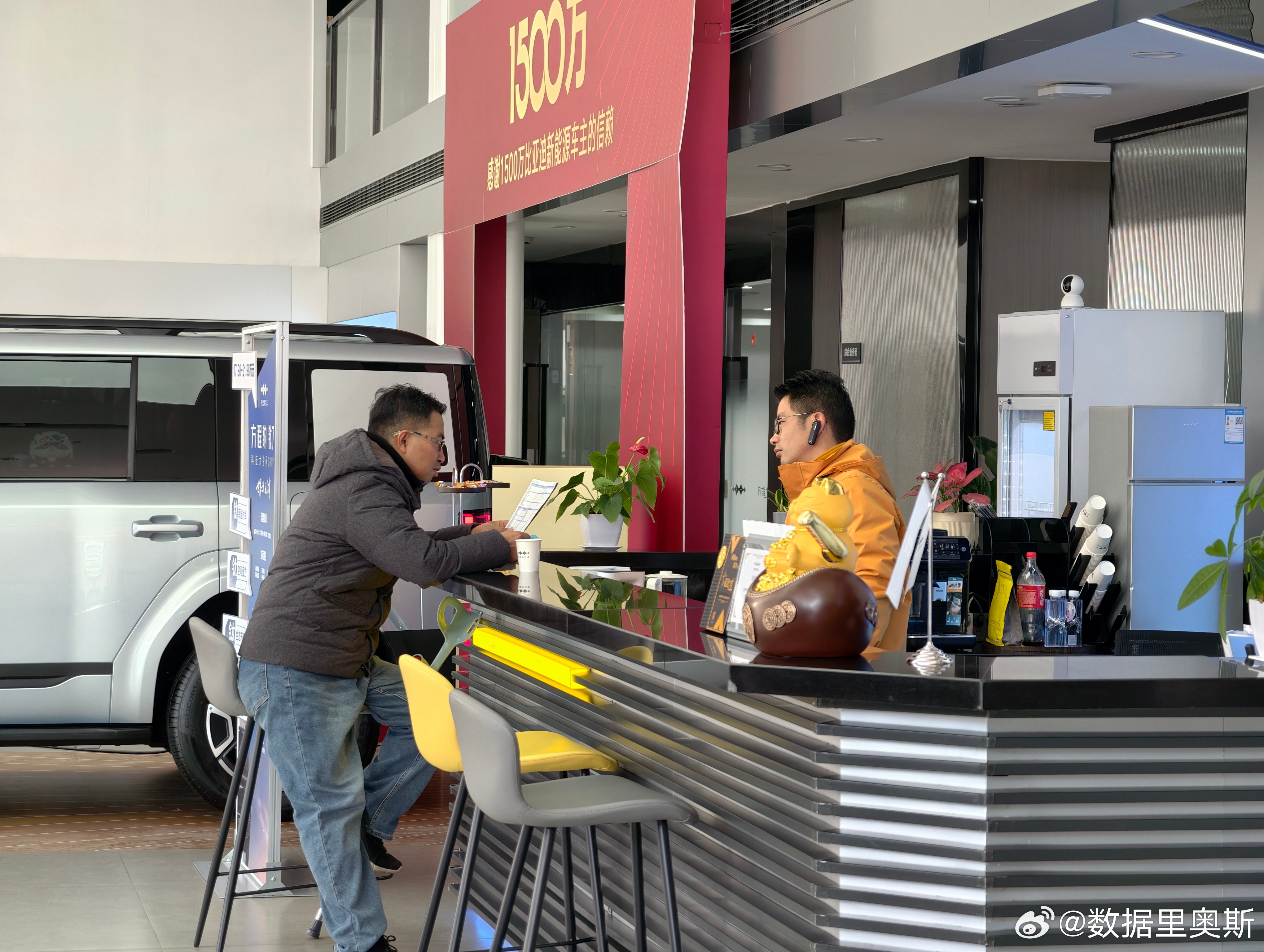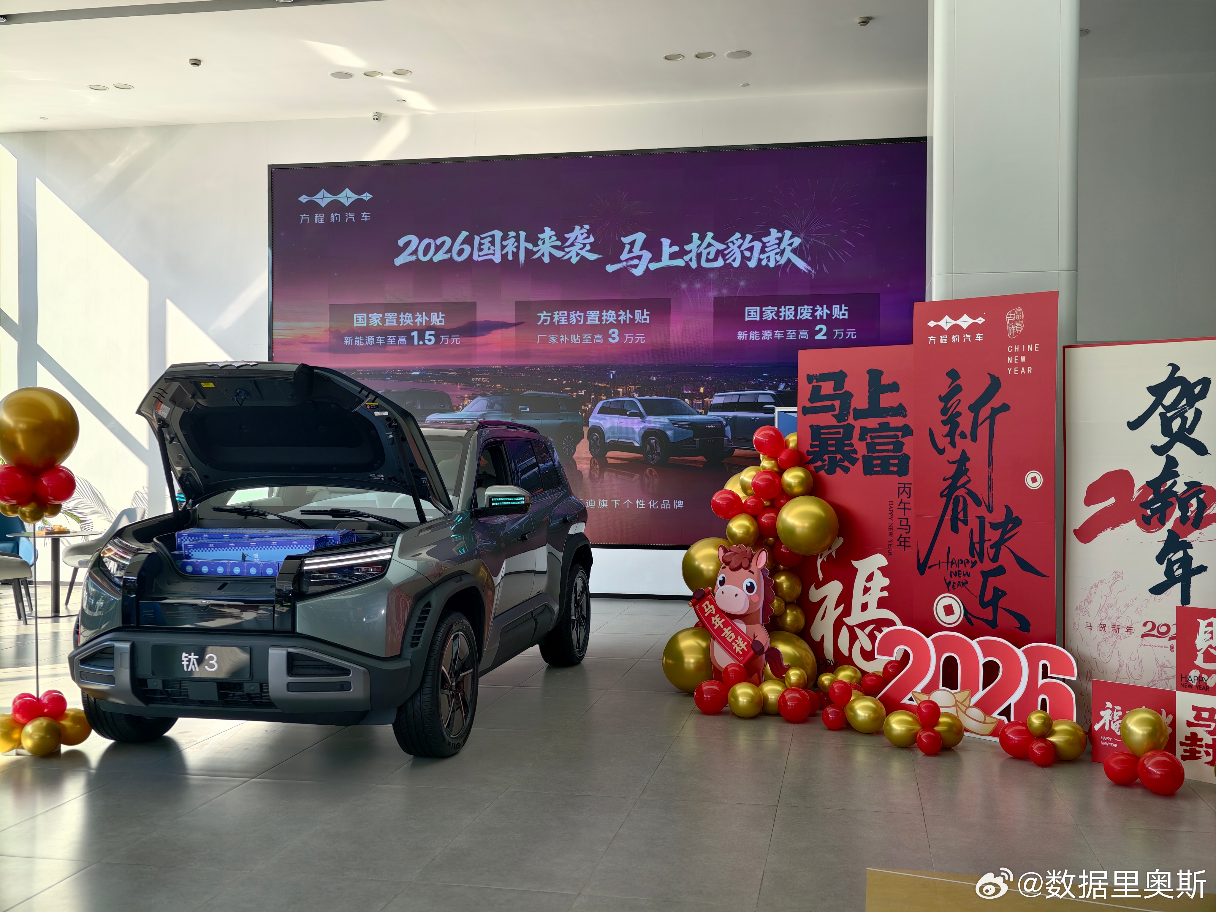 周末陪老婆给小海豚做保养,顺便去逛了逛旁边的比亚迪方程豹4S店,现在商场店逛的多,这种综合性的 4s 很多时候我还停留在老印象里,以为会显得比较旧,没啥活力,结果还是很出乎我意料的!门店里马年新春装饰氛围感拉满,钛3展车霸气亮相,搭配“马上抢豹款”的补贴海报,购车氛围直接拉满。最让我惊喜的是越野共创区,各类专业越野装备陈列得十分精致,把方程豹的硬核属性展现得淋漓尽致。工作人员在为到店顾客细致讲解车型配置和优惠政策。休息区还布置了大屏电视和按摩区,精诚BAR的货架上零食饮料满满当当,逛店的体验感直接拉满,比亚迪这服务细节真的没话说!比亚迪方程豹探店新能源4S店比亚迪