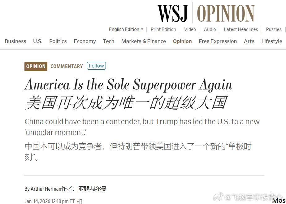 WSJ文章《美国再次成为唯一超级大国》,让你们见识一下西大赢学——作者认为,在特朗普领导下,美国再次进入类似二战后、冷战后那样的“单极时刻”——全球只剩下一个真正主导国际秩序的超级大国,而这个国家就是美国;中国原本有机会竞争,但已经明显掉队。🔻文章认为,近一系列重大国际事件表明,美国正在掌控世界事务的节奏和方向,包括对伊朗核设施的打击、加沙停火的促成和马杜罗被抓。作者甚至暗示,这种主导力未来可能扩展到伊朗的政权更迭。结论就是:美国不仅是超级大国,而且重新“一枝独秀”,中国“退居明显的第二梯队”。🔻作者认为超级大国地位不仅要靠军事,还靠经济与科技。经济方面2026年美国GDP增长预期在 2%–5%以上,科技方面美国正在则在人工智能、量子计算、航天等领域“重新领先中国”。并且美国正缩小对中国稀土的依赖,削弱中国的关键经济杠杆。🔻文章认为,美国的能源与贸易政策是“新单极”的关键工具。石油产量接近每日1400万桶,压低全球能源价格,削弱俄罗斯的地区霸权前景。通过重新激活委内瑞拉石油出口,对中国能源安全形成“匕首般的威胁”。关税政策不仅用于“公平贸易”和财政收入,更被用来操控全球贸易结构,利用美国作为全球最大消费市场的地位,配合减税、放松监管,推动了美国制造业复兴。🔻美国如何失去、又如何夺回单极地位的呢?作者回顾了美国过去25年的起伏:苏联解体后,美国曾独霸全球,这是黄金期。失误在工业空心化,依赖“和平红利”削弱军工基础,阿富汗、伊拉克战争消耗国力——而中国与俄罗斯趁势崛起。🔻作者对历届政府的评价(立场明显):奥巴马时期美国实力继续下滑;特朗普第一任期“遏制了俄罗斯在东欧的野心,压制中国在东亚和南海的进取姿态”,并通过制裁几乎“瘫痪”伊朗;拜登政府被作者强烈批评,称其从阿富汗撤军是“灾难性的”,对俄罗斯入侵乌克兰态度软弱,以及放任伊朗通过代理人重返中东,最终导致2023年10月7日以色列遭袭。🔻作者认为中国“错失超级大国机会”——原本有机会成为超级大国,但现在“面临严重的经济问题”、“未能保护伊朗、委内瑞拉等客户国家”、“一带一路”项目停滞不前……因此,“21世纪是中国世纪”的说法正在破产。🔻但是呢,作者又认为“虽然中国的影响力在收缩,但中国依然危险”。文章承认“中国仍然强大”,但又指出“从欧洲、中东到南美、东南亚,是美国在设定议程”,而“中国陷入战略危机”,中国“唯一剩下的战略重点是台湾”。作者特别用一个富含贬低意味的对比进行了总结:美国剑指全球,所向披靡 VS 中国最大的战略威胁指向一个距离大陆不到100英里、人口只有大陆1/60的岛屿——全球和小岛的不匹配,“恰恰说明了中国的全球影响力的萎缩”。🔻作者结论:美国赢了,但又认为“时间窗口有限”。所以作者最后警告称,新一轮大国竞争已经结束,美国胜出,但历史证明“单极时刻往往短暂”。所以第二届特朗普政府的任务是“防止优势再次流失”和把美国的主导地位转化为“自由世界更安全、更繁荣的未来”。烽火问鼎计划飞扬军事热点观点 那美国到底赢了还是没赢?