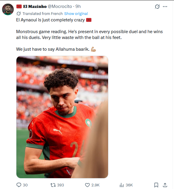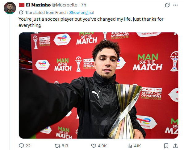 艾纳维在非洲杯上可以说是大放异彩了,摩洛哥球迷是这样评价他的,吹上天了简直…周末加油拿个冠军回来吧,虽然罗马这段时间急需用人,但艾纳维踢非洲杯的收益也很高,他在俱乐部是替补,在国家队是主角,可以凭借这届杯赛涨涨球、提升自信。