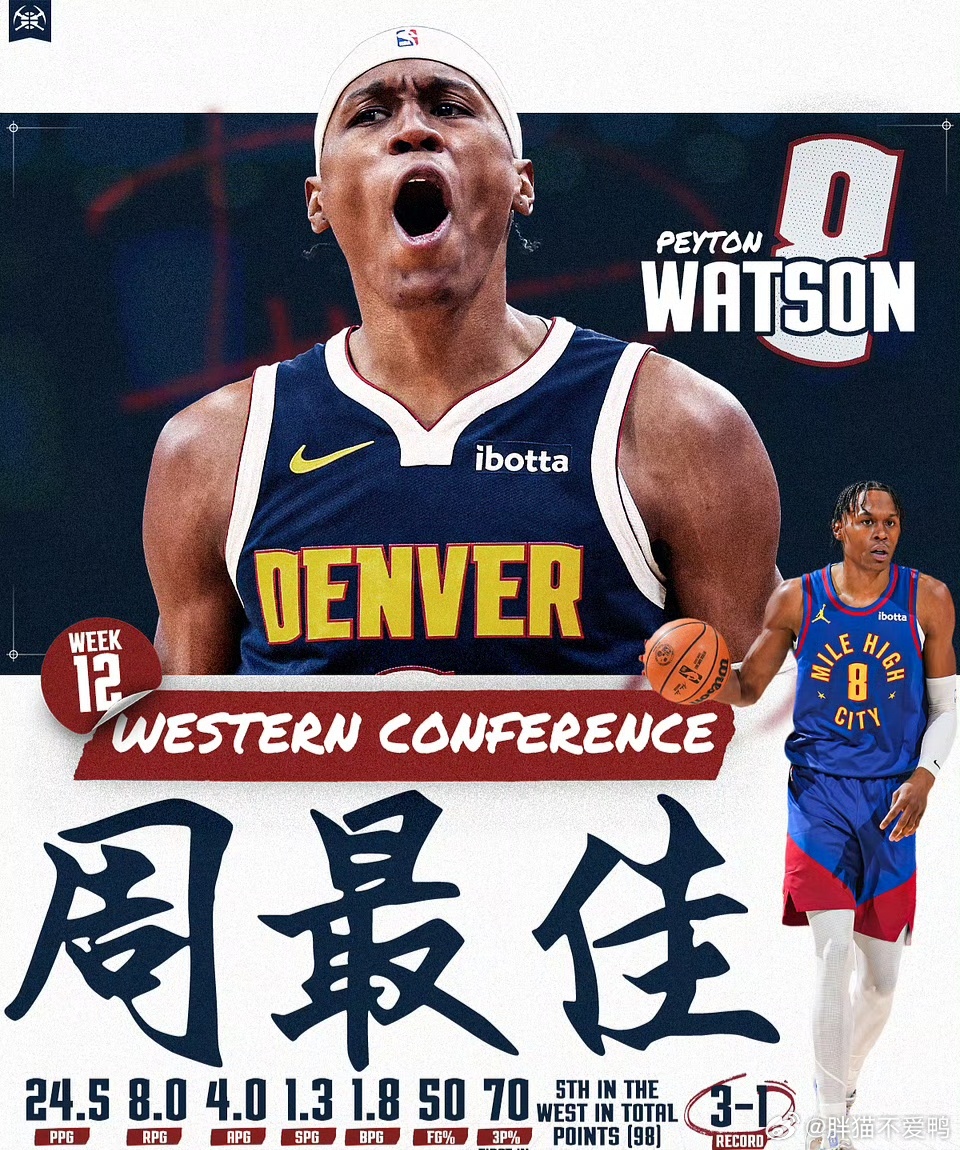 掘金赚了1个亿!能力压SGA,华子等人!还能得到死神称赞!他是何人?又给掘金挖到宝了!我湖怎么就挖不到呢!杜兰特在沃特森近期获得周最佳球员奖后,发ins对沃特森大加称赞!杜兰特曾激励沃特森,让他相信即使身材瘦削,也能凭借自身体型在球场上成为“赛场杀器”。沃特森16岁时,杜兰特曾现场观看他的比赛。杜兰特对其表现印象深刻,便邀请他在夏天一同打野球。沃特森告诉ESPN:“这绝对是我梦想成真的时刻。”自那以后,杜兰特便成了沃特森名副其实的良师益友!最近掘金的佩顿沃特森(Peyton Watson)像坐火箭一样蹿升,尤其是上周生涯首次当选NBA西部周最佳球员,彻底火了。大家都在问:这个年轻人怎么突然就爆发了?一切的转折点,或许要从球队核心约基奇受伤说起。2025年12月底,约基奇左膝受伤退场,掘金队瞬间陷入困境。但所谓“时势造英雄”,沃特森抓住了这个千载难逢的机会。在上周他获选周最佳的表现里,数据堪称华丽:场均24.5分8篮板4助攻,更惊人的是三分球命中率高达70%,和穆雷一起带领伤兵满营的掘金取得了3胜1负的战绩。对阵鹈鹕,他16投11中高效砍下29分7篮板5助攻,展现了他全面的身手。这与他本赛季场均10.5分4.8篮板1.6助攻的稳定输出一脉相承,但显然,在球队需要他扛起更多责任时,他给出了远超预期的回应!而沃特森的进步不是一蹴而就。作为2022年首轮第30顺位被掘金选中的球员,他的起步并不高光。新秀赛季,他主要在板凳末端学习,随队幸运地获得了一枚总冠军戒指,但个人数据并不起眼。真正的转变始于信任。本赛季,新帅阿德尔曼看到了他的潜力,给予了他更多发挥的空间。对比上赛季,他的提升是全方位的:首先进攻端:从单一的防守和空切角色,进化成一个可靠的得分点。他的投篮命中率提升到50.3%,三分命中率达到39.1%,这让他在外线的威胁大大增加。2025年11月对阵鹈鹕单场32分12篮板的生涯之夜,就是他进攻天赋的集中体现。而沃特森之所以能实现“质的飞跃”,有几个关键原因:其一,精准的投篮训练成果——本赛季高达39.1%的三分命中率和上周夸张的70%远投表现,相信他在背后肯定是付出了巨大努力!其二,拥有出色的防守根基——早在大学时期,他就以防守见长。本赛季他场均仍有超过1次的盖帽!其三,成熟的比赛心态——获得周最佳后,他在社交媒体上写道:“压力是一种特权。” 在采访中,他则清醒地表示,希望这个奖项“只是众多奖项的开始”。丹佛掘金沃特森杜兰特崛起