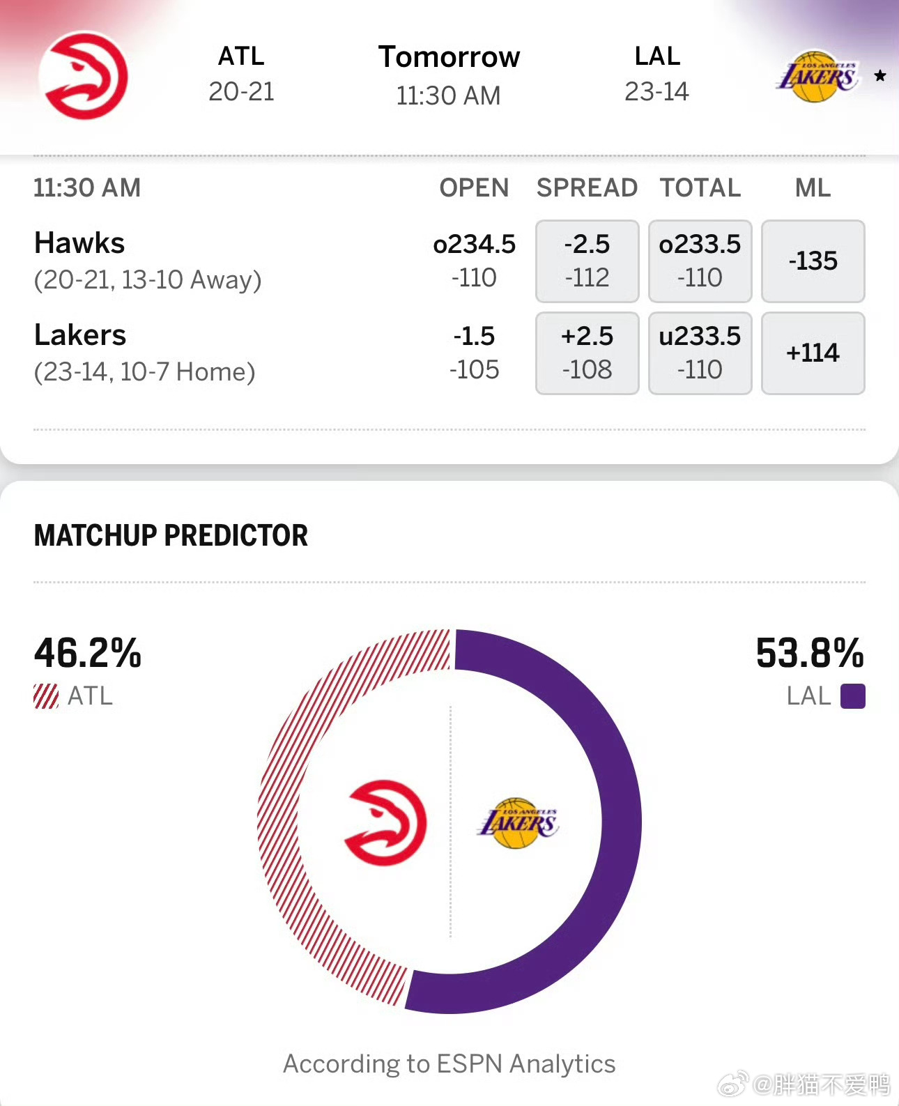 湖人老鹰今日比赛预告来了!ESPN这次预测湖人胜率53.8%!而老鹰46.2%!双方上一次交手,湖人惨败给老鹰20分!湖人这边,昨天打国王是真窝囊!面对西部倒数第二且还是背靠背,湖人全场都被压着打,三分投不开,防守也做不好,全队仅四人上双,首发5人组,仅东契奇一人命中三分,其余四人合计13中0,今天打老鹰,估计又是一场大败!老鹰这边,上一场打勇士,全队多点开花!6人上双三分合计39投15中,新援cj麦科勒姆也拿下12分,正负值高达+19!本赛季的老鹰是一支极其会分享球的球队,场均助攻联盟第一,在新鹰王约翰逊以及队内一众好手的带领下,绝对不是弱队!湖人今天输10分以内就算赢了!双方近5战:湖人2胜3负老鹰3胜2负双方伤病名单:湖人-东契奇(左腹股沟酸痛)詹姆斯(左脚关节炎、右侧坐骨神经痛)出战成疑!海斯(左腿筋酸痛)里夫斯,蒂耶罗缺席!老鹰-肯纳德,纽厄尔(右股四头肌挫伤)出战成疑!波尔津吉斯(左跟腱炎)里萨谢(左膝骨挫伤)丹特(十字韧带撕裂)缺席!双方预测首发:湖人-拉拉,艾顿,刚哥,文总,彪哥老鹰-沃克,约翰逊,奥孔古,克雷伊奇,丹尼尔斯双方攻防对比:湖人-进攻11,防守26老鹰-进攻17,防守14湖人洛杉矶湖人湖人国度詹姆斯东契奇