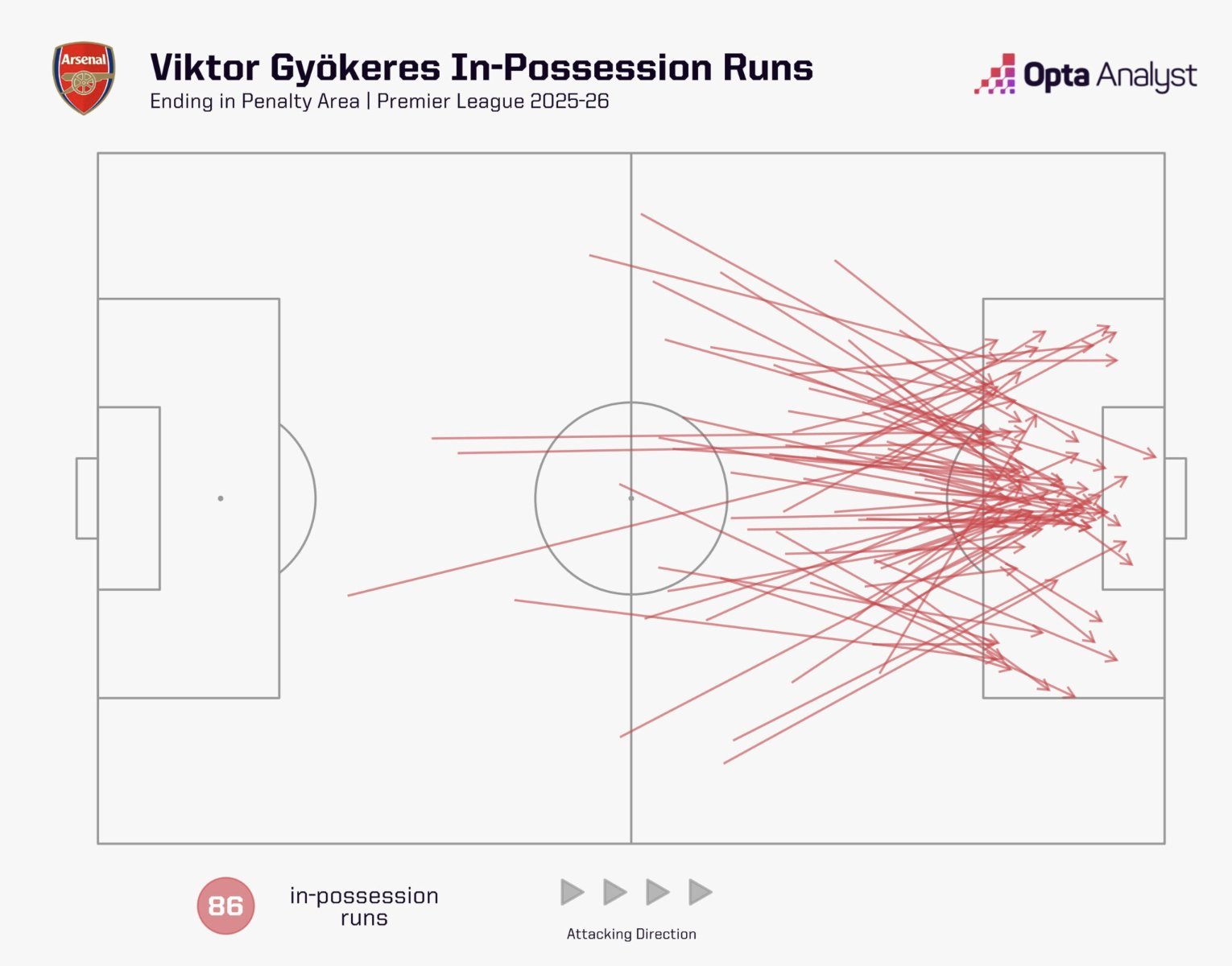 本赛季英超联赛中,当本方控球时,哲凯赖什已经完成了86次无球跑动进入对方禁区——持续2秒以上的高强度无球跑动,场均达到了6.3次。在出场时间超过 1000 分钟的球员中,只有加克波(6.5次)比他更多。