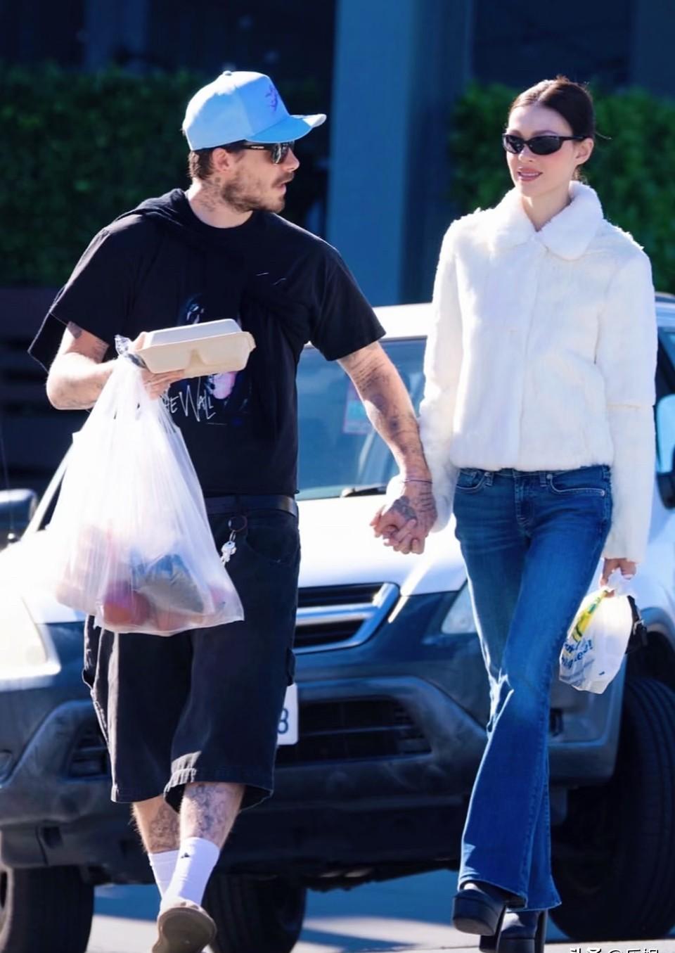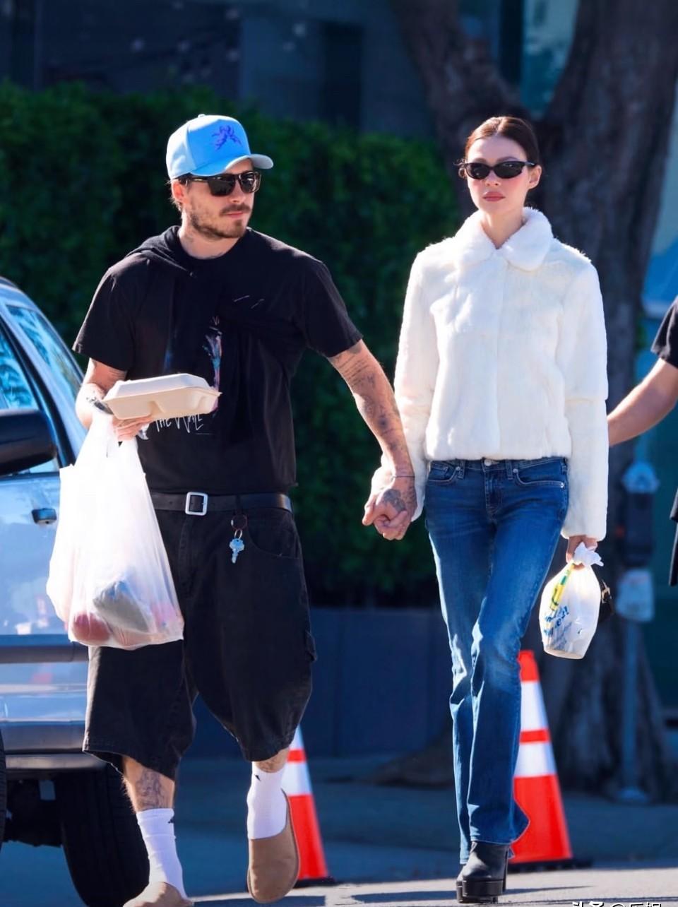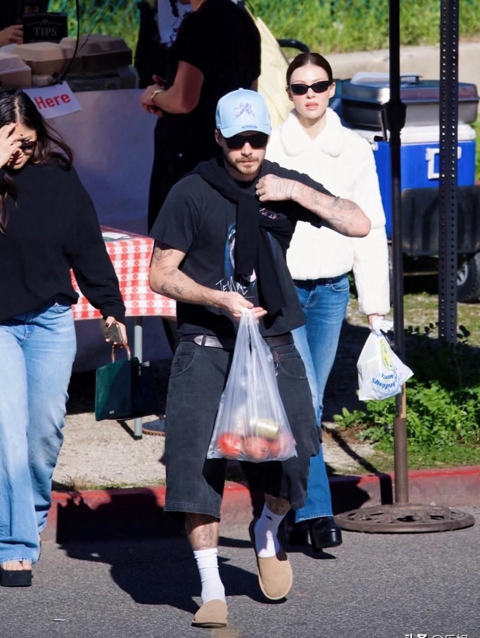 比弗利山庄的午后,布鲁克林一手三个购物袋,另一手紧攥饭盒,妮可拉只捏着个小纸袋。