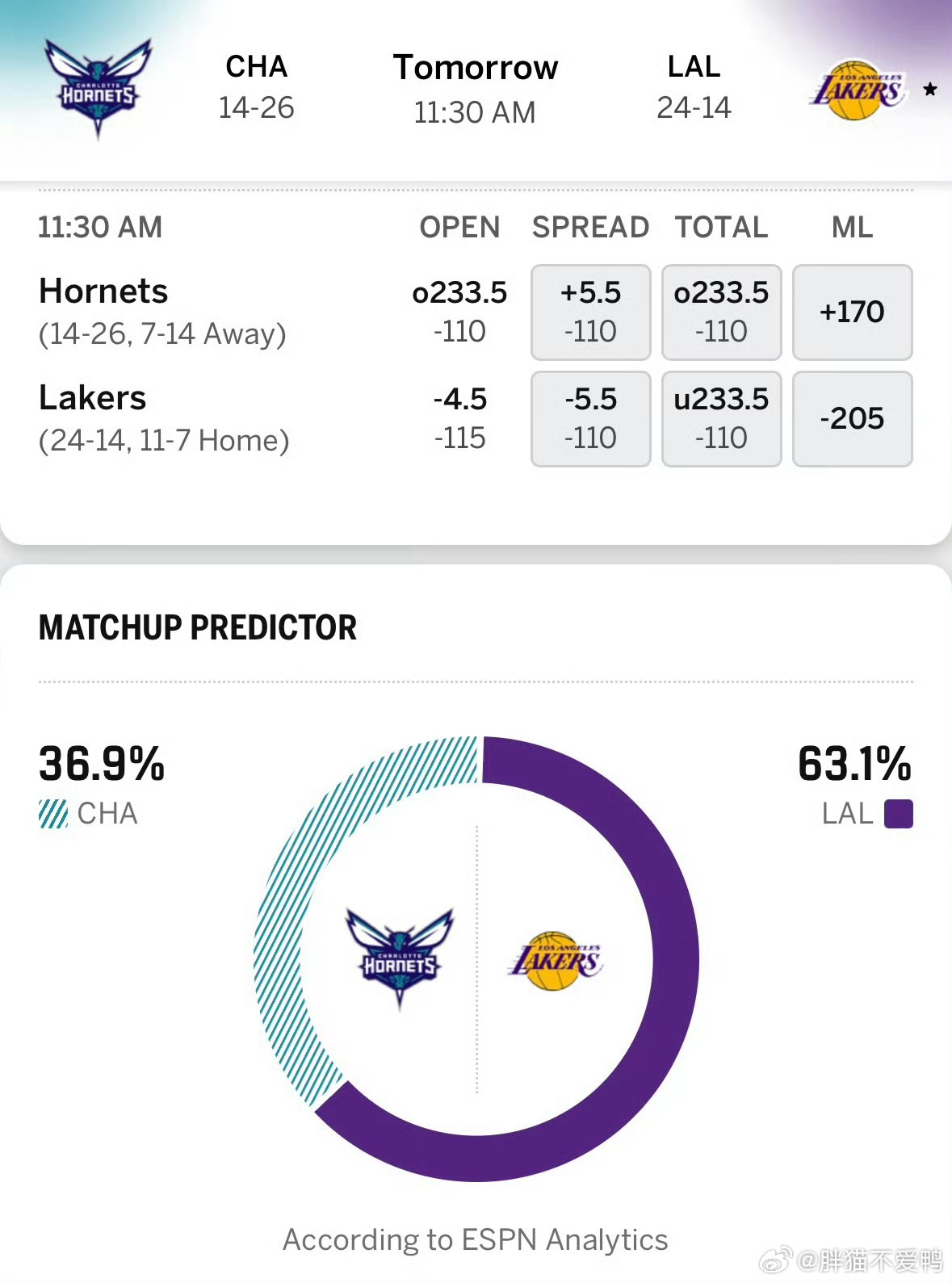 湖人黄蜂二番战明日比赛预告!湖人老头东子脱离伤病名单!明天上午湖人主场对阵黄蜂,ESPN预测湖人胜率高达63.1%!而黄蜂只有36.9%。湖人在昨天对阵老鹰,打出了本赛季最强一战,几乎全员皆兵,首发5人组全部上双,老詹本赛季第一次背靠背也高效砍下31分9篮板10助攻准三双数据,如同定海神针一般,明天就看湖人能否延续状态了!而黄蜂这边上一场惜败给快船8分!黄蜂这场也无奈,遇到最近火热状态的小卡,且哈登昨天也状态不错,两人合砍67分!黄蜂就鲍尔拿了25分,进攻火力对不上!但黄蜂还是不能小看,本赛季也是灭雷队之一!双方近5战及总战绩排名:湖人近5战2胜3负,24胜14负西部第5黄蜂近5战2胜3负,14胜26负东部第12双方预测首发:黄蜂——鲍尔,克努普尔,米勒,布里奇斯,迪亚巴特湖人——东契奇,斯玛特,拉拉维亚,詹姆斯,艾顿双方伤病情况:湖人这边——海斯(左腿筋酸痛)出战成疑!里夫斯、蒂耶罗继续伤缺。 黄蜂这边——迪亚巴特(右臀酸痛)、塞克斯顿(左腿筋酸痛)出战成疑!普拉姆利(右侧腹股沟手术)继续伤缺。双方攻防数据对比:湖人进攻效率联盟第8,防守效率第25黄蜂进攻效率联盟第11,防守效率第21湖人詹姆斯洛杉矶湖人湖人国度