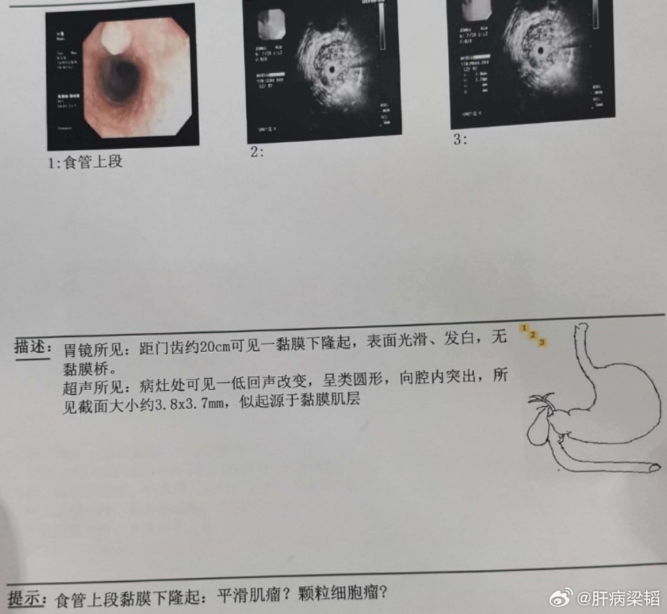食管颗粒细胞瘤是一种罕见的食管间叶源性肿瘤,多为良性,恶性病例极少,常起源于食管黏膜下或固有肌层,其病理特征与全身其他部位颗粒细胞瘤一致。📍 临床特点1. 发病人群与部位可发生于任何年龄,以中青年人多见,男女发病率无明显差异好发于食管中下段,多为单发小病灶2. 症状表现多数患者无明显症状,仅在胃镜检查时偶然发现少数病灶较大(直径>2cm)或位于食管上段者,可能出现吞咽异物感、轻微吞咽困难,罕见呕血、胸痛等症状🧬 病理与诊断1. 病理特征肿瘤细胞呈巢状或条索状排列,胞质富含嗜酸性颗粒(线粒体聚集所致)免疫组化典型表现为S-100蛋白阳性、CD68阳性,有助于与食管平滑肌瘤、间质瘤等鉴别2. 诊断方式胃镜检查:可见食管黏膜下圆形或类圆形隆起,表面黏膜光滑完整超声内镜(EUS):可明确肿瘤的起源层次、大小及与周围组织的关系,是术前关键检查病理活检:需结合免疫组化才能确诊,因表面黏膜活检常难以取到肿瘤组织,多需内镜下切除后行病理检查✅ 治疗与预后1. 治疗方案无症状、直径<1cm的小病灶:可定期胃镜随访观察有症状、病灶较大(直径≥1cm)或无法完全排除恶性者:首选内镜下微创切除(如ESD、EMR),创伤小、恢复快极少数恶性病例(伴浸润、转移):需行外科手术切除联合放化疗2. 预后情况良性食管颗粒细胞瘤预后极佳,术后复发率极低恶性病例罕见,预后主要取决于是否存在远处转移,总体生存期较其他食管恶性肿瘤更好⚠️ 需及时就医的情况胃镜发现食管黏膜下隆起,无法明确性质时出现不明原因的吞咽异物感、吞咽困难,且持续不缓解术后随访发现病灶复发或出现新的异常病灶。