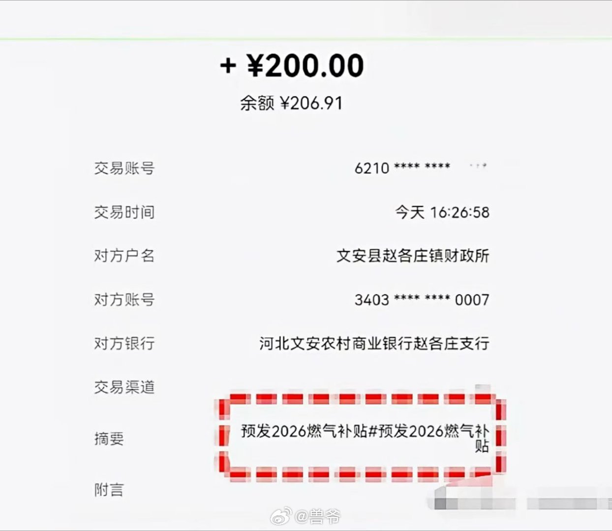 今天,河北多个地方的农民,陆续收到了采暖补贴,标准是每户200元。也有消息称,这是第一期省级补贴,后续可能还有市县补贴,额度与用气量有关。收到补贴的地方包括石家庄、邯郸、邢台、廊坊、唐山、保定、沧州等