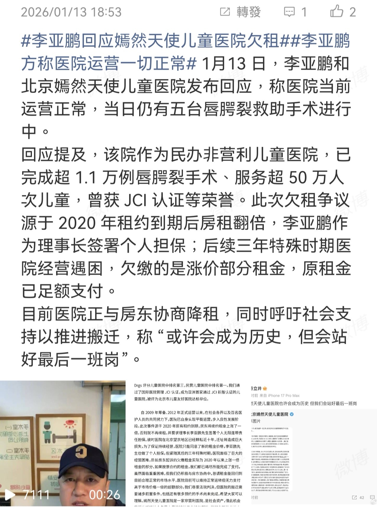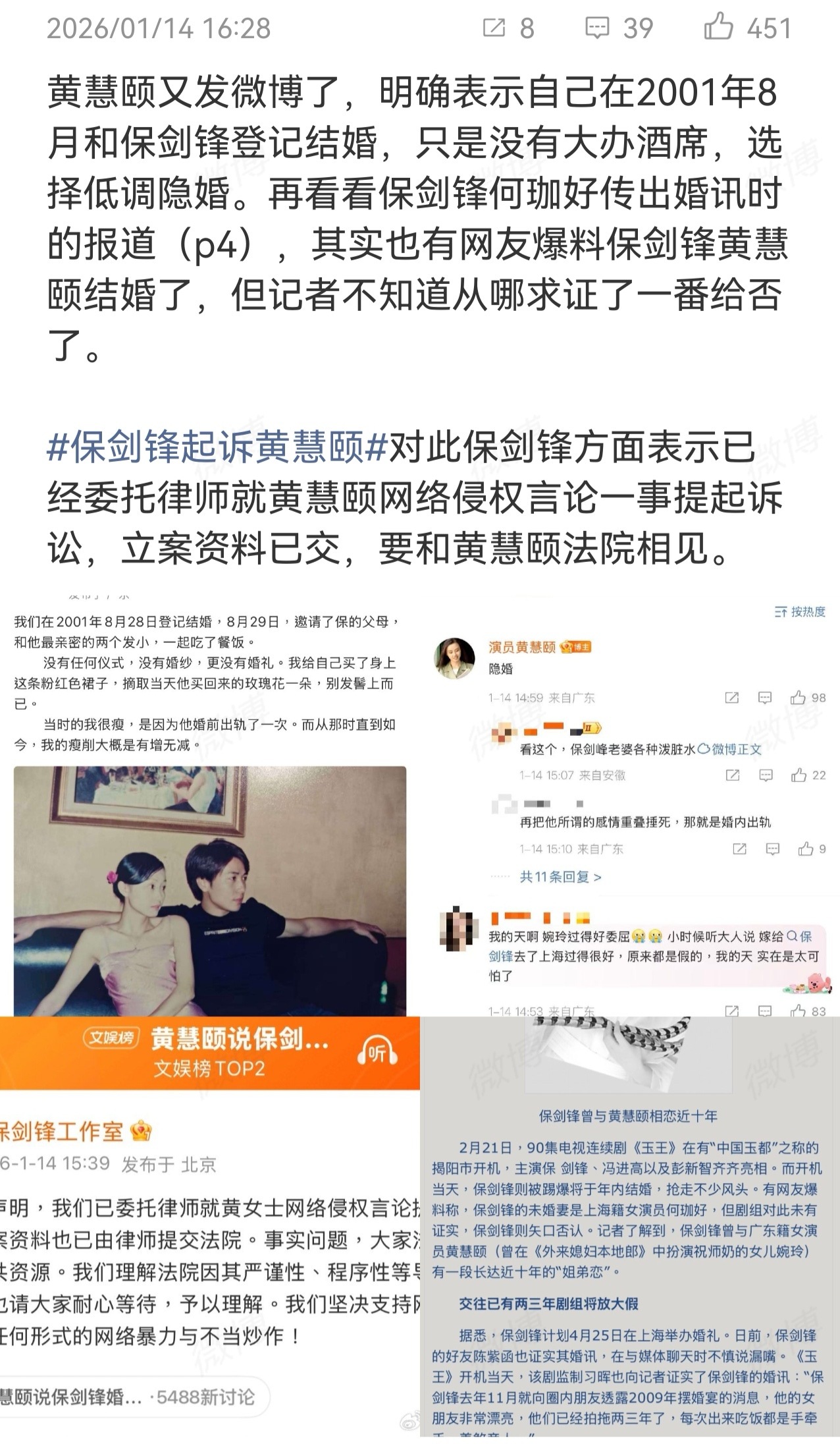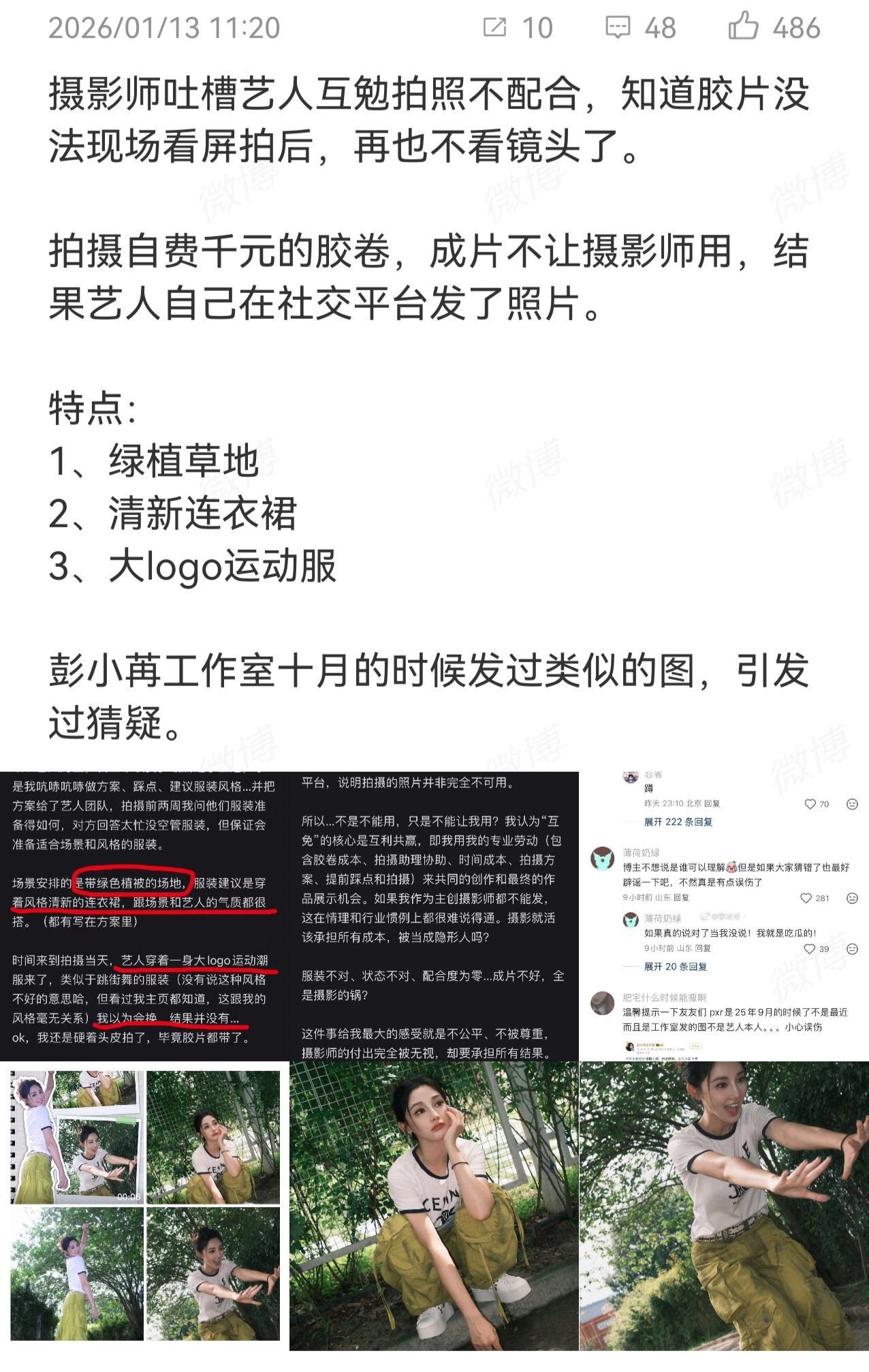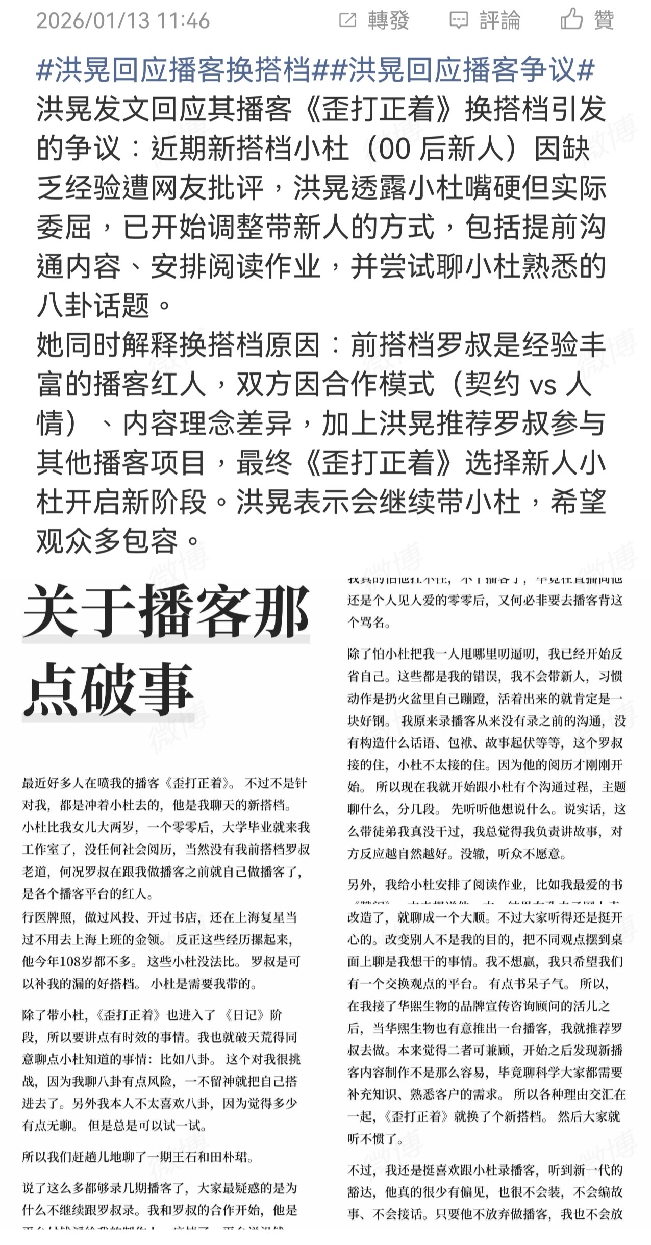 2025-01-14总结①壹心,短期停招,降薪 图1②刘耀文对接辟谣十日终焉 图2③洪晃发文回应其播客《歪打正着》换搭档引发的争议 图3④李亚鹏回应嫣然天使儿童医院欠租 图4⑤盛世天下,饰演上官婉儿的演员彭十六因偷税漏税被通报并全网禁言 图5⑥演员保剑锋工作室起诉前女友黄慧颐,因其公开发布涉及保剑锋"婚前出轨""隐婚"等言论 图6⑦MLB抽奖,网友以为中奖可得工装羽绒服,最终收到的却是巴掌大小的同款造型挂件 图7撕❶摄影师吐槽艺人互勉拍照不配合,成片不让用,转头艺人在社交平台发照,网友推测彭小苒 图8❷林允站姐宣布关站,隐藏了300多条美图博,全平台注销账号,个人主页背景还说世界上没有不透风的墙。图9粉丝澄清,是因为站子跟新团队磨合不好 图10❸于适粉不满迪奥白嫖,要求品牌升全球抬头 图11❹可隆,广告图,刘诗诗粉认为区别对待,维权 图12❺金晨在直播中直接回应网传新剧《明川有知夏》的质疑,强调该剧并非“烂饼” 图13❻成毅发声明,说最近被跟车,车子还被用红油漆写了恶毒语言,成毅粉说肖战粉干的。肖战粉叫去报警,怀疑自导自演, 图1412号网页链接
