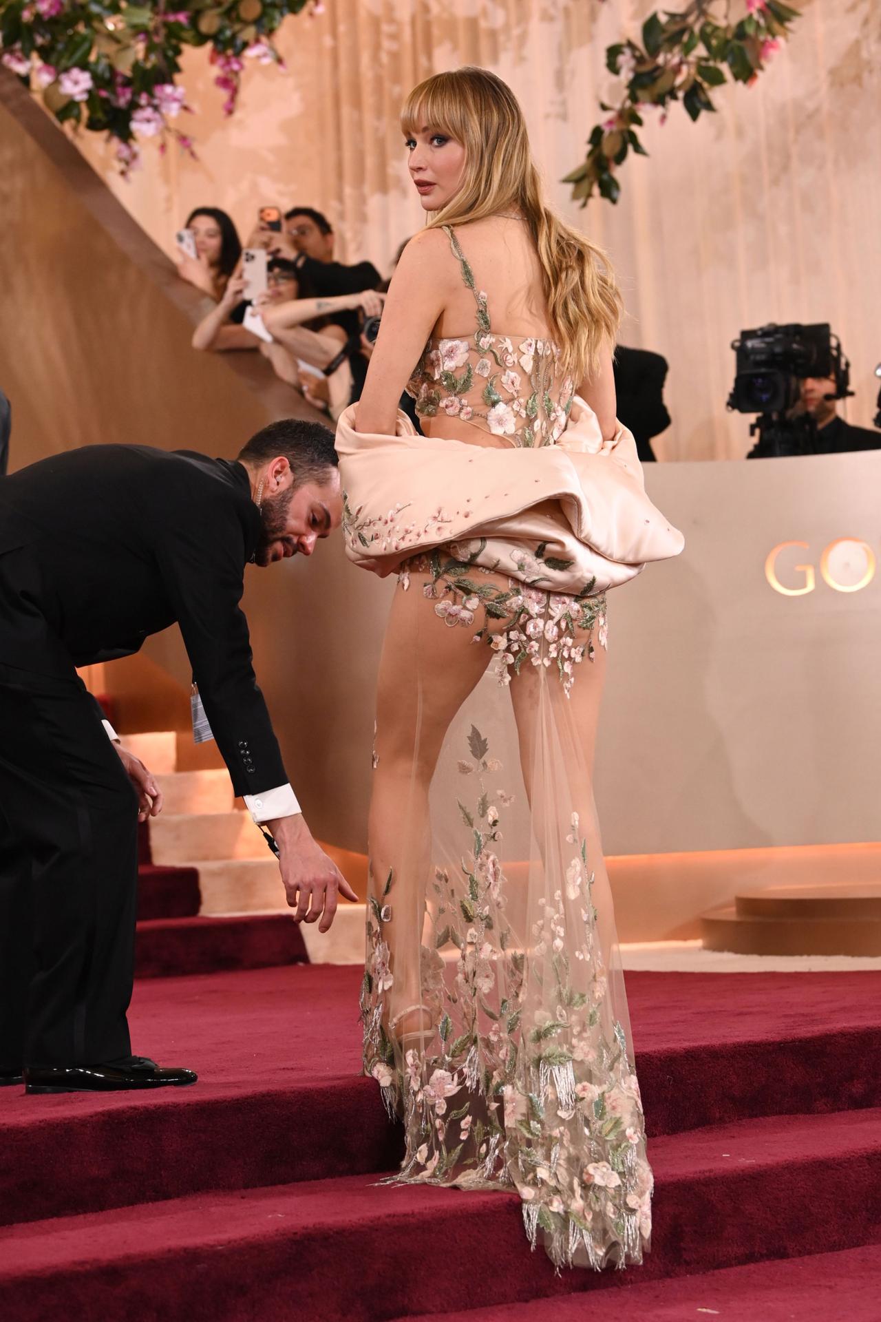 珍妮佛·劳伦斯 (Jennifer Lawrence) 美国女演员,1.75 米。她在2026年金球奖颁奖典礼上的照片,展示了她身穿由莎拉·伯顿设计的纪梵希透视礼服,这件礼服上的花卉刺绣将透明感与优雅完美融合,惊艳亮相红毯。