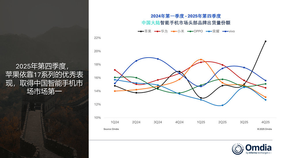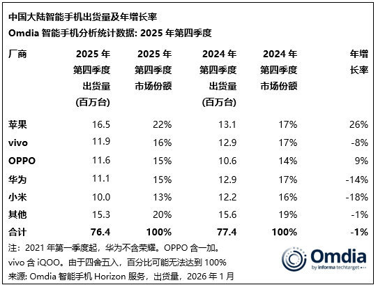根据Omdia,华为以4680万台的出货量时隔五年重回第一,占据17%市