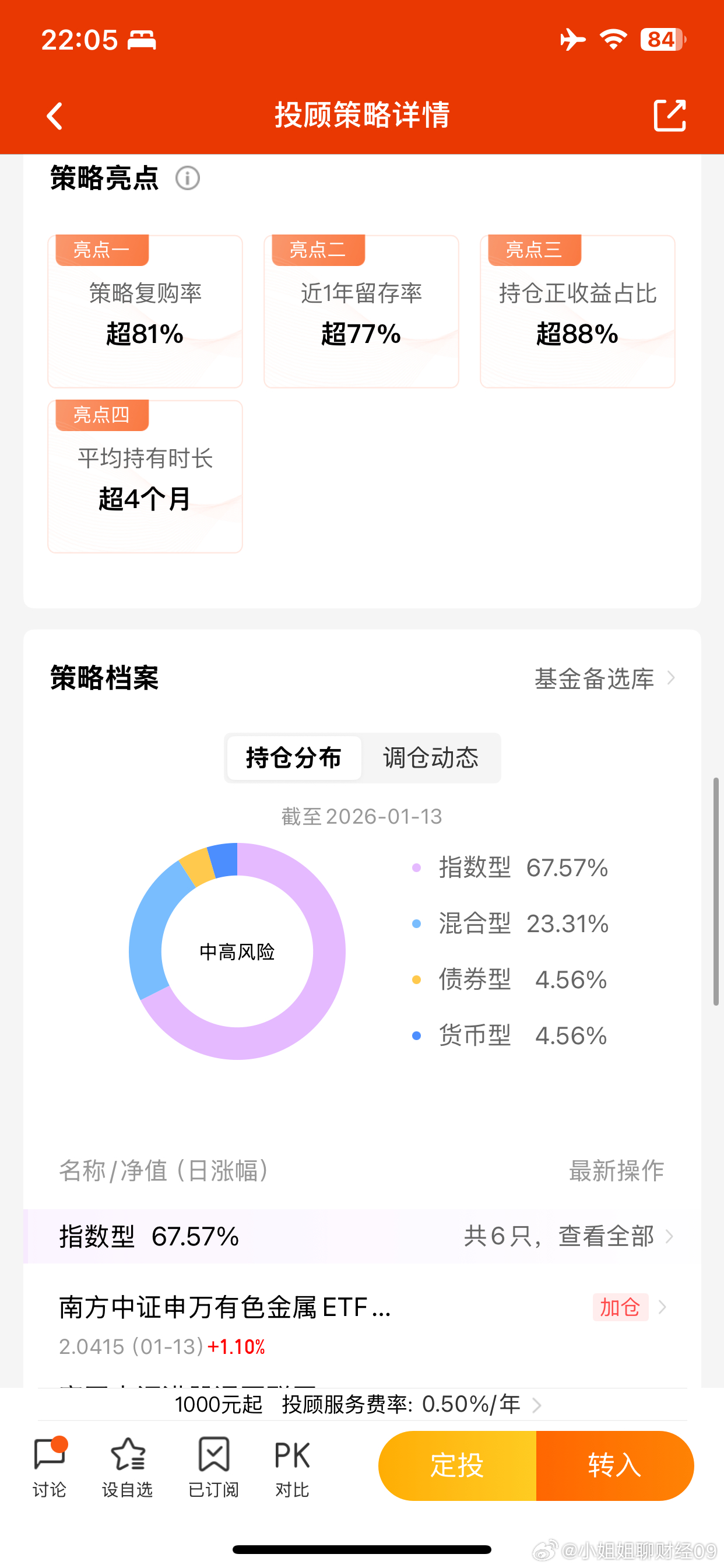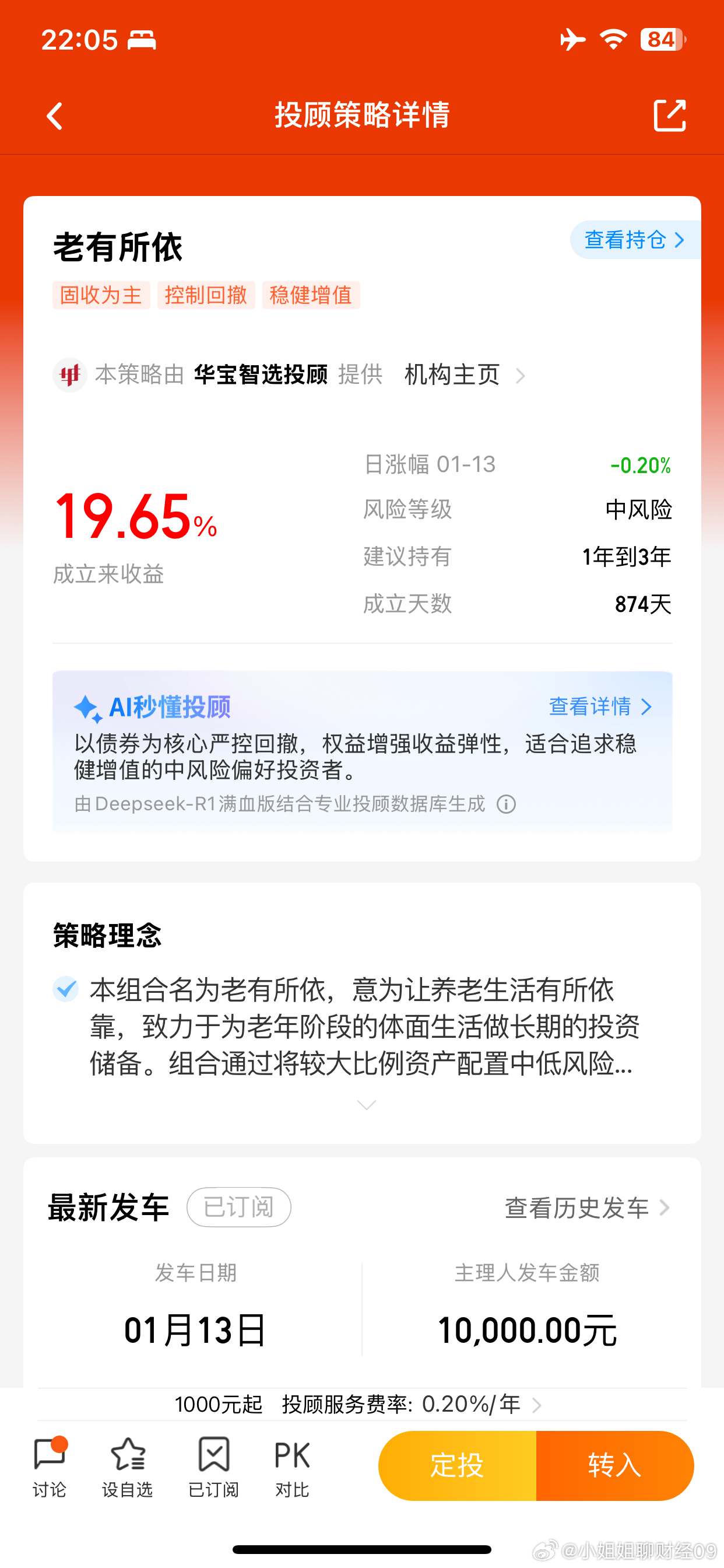 投顾跟车晒收益:富贵闲人逆势上涨0.34%,老有所依-0.20%今日跟车2000元富贵闲人,这是一个买股票基金的投顾组合。市场太强了,富贵闲人2026年连续大涨,涨幅来到了6.75%,今年组合收益有望超越去年,达成40%的目标。对于一季度的行情,组合表示乐观,目前依旧是可以买入的时机。组合也会高频跟踪市场,在市场调整前,提前减仓止盈,守住收益,无需持有人自己操作。【富贵闲人】今日逆势上涨+0.34%,近一年涨40.21%,成立2年多年化回报19.72%。买入10万块,今日收益+340元,近一年赚了40210元,长期持有每年平均赚19720元。今日跟车1000元老有所依,这是一个买稳健资产、年赚6%的稳健组合。老有所依提前布局长期业绩出色的固收+基金,同时坚定拿住了黄金,高仓位吃到了开年这波股市和黄金的大涨行情,涨幅稳稳取得2.04%,超过银行存款一年的收益。对于后市,组合依旧保持乐观,但也会高度警惕,不会让持有人坐过山车,控制住波动,组合历史表现稳健,值得信任。【老有所依】今日下跌0.20%,近一年上涨+9.44%,成立2年多年化回报+8.16%。买入10万块,今日收益-200元,过去一年赚了9440元,长期持有每年平均赚8160元。当下行情,推荐富贵闲人和老有所依配置比例7:3或者8:2,闲钱可一笔买入,后续跟车定投,坚定持有,终有回报。跟投方法:天天基金或京东金融平台,首页搜索关键词:富贵闲人,或者,老有所依。微博股票基金股票a股市场行情