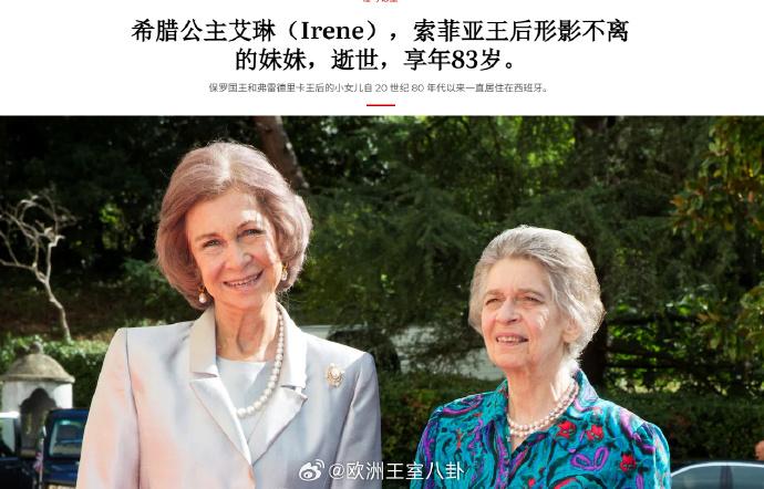 据西班牙媒体,当地时间1月15日上午,希腊艾琳公主病逝,享年83岁 她是末代国王康斯坦丁二世和西班牙索菲亚王后的小妹,终身未婚也没有后代。希腊共和后因为姐姐嫁到西班牙王室,她长年生活在马德里,跟大姐关系极好,对音乐、印度宗教哲学有讲究,也参与多项慈善活动 她身体不好已经有一段时间,更是早早就得坐上轮椅。前两天王室官方说索菲亚取消一堆公务,应该就是不行了。最后一次在公众前出现不知道是不是去年2月希腊二侄子尼古拉斯的二婚婚礼