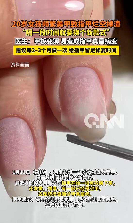 “悲剧还是发生了!”1月11日,河南郑州,一女子特别喜欢做美甲,每隔一段时间都要换个新款式,可最近卸甲时,她发现指甲开始一抠就碎屑,还发黄、增厚,并且有一部分已经是空甲,去医院检查,竟确诊甲真菌病!网友:还敢频繁做吗? 每一次做美甲,你以为只是花了几百块换个造型,实际上是在用角质层的库存换取短暂的视觉满足。这个账本藏在肉眼看不见的微观世界里,等到余额耗尽那天,身体会用最暴力的方式把账单甩到你面前。 1月11日,河南郑州那个姑娘收到的就是这样一张催缴通知。正值弱冠之年的她,与众多青春少女别无二致,痴迷于指尖流转的精致韵味。 在她看来,那修长的甲片宛如灵动点缀,可让手型瞬间焕发出别样的优雅气质。旧款卸掉的当天就得换上新的,中间几乎没有空档期,以至于她都快忘了本甲长什么样。 转折来得毫无预兆。卸甲时她发现指甲像融化的糖霜,一碰就掉粉末状的碎屑,颜色发黄得像烟熏过,厚度也不正常。最吓人的是有几个指甲居然和肉分了家,呈现出诡异的悬空状态。医院确诊结果是甲真菌病,俗称灰指甲,直接宣告这场美丽游戏破产。 这套损耗机制的运转逻辑其实很粗暴。美甲店若想使胶体与甲面紧密贴合,会先用挫条将指甲表层打磨一圈,此操作在业内被称作“打底处理”,能增强胶体附着度,打造持久美甲效果。那层被磨掉的东西看着不起眼,实际上是生物防御系统的第一道闸门,负责锁水和拦截外来威胁。反复磨损等于把城墙拆了又建、建了又拆,最后整个防线彻底瓦解。 真菌这种东西无处不在,平时进不来是因为有屏障挡着。防线一旦崩塌,它们宛如嗅到血腥气息的鲨鱼,敏锐地捕捉到缝隙,长驱直入,顺着裂缝悄然钻进甲床深处,在那里安营扎寨,繁衍滋生。 更麻烦的是美甲工具的流转风险,上一个顾客留下的病原体可能正通过死皮剪和推钢传递给下一个人,这种交叉污染的概率比想象中高得多。 化学试剂的侵蚀是另一条暗线。甲油胶和卸甲水里的溶剂会把指甲榨干,让它变得像干枯的树皮,韧性归零。这时候再遇上外力碰撞或者真菌入侵,指甲基本没有还手之力,甲沟炎、甲床萎缩这些并发症会接踵而至。 身体这套系统的修复速度远远跟不上你的消耗频率。皮肤科医生给出的周期建议是两到三个月一次,每次操作后必须空出四到六周让角质层重新生长。这段时日,涂抹修护油,悉心补充营养,恰似为透支的账户注入一股暖流,使其渐渐回血,重归充盈之态。很多人就是不愿意等这个周期,总觉得素甲太难看,结果越急越烂。 指甲的状态能映射出整个人的健康水位。它光滑饱满说明气血充足,一旦出现异常纹路、颜色偏离或者质地改变,都是内部系统发出的预警信号。在这个逻辑下,频繁美甲其实是在消耗健康储备来维持表面光鲜,等于拆东墙补西墙。 真正的聪明是知道什么时候该停手。美甲这件事本身没错,错的是把它当成日常刚需无限循环。偶尔为之是点缀,常态化就成了慢性自残。那些看起来炫目的款式背后,藏着的可能是一场看不见的生物危机。 这笔账怎么算都不划算,除非你觉得几个月后的烂甲和治疗费用,值得换取现在的十指光鲜。