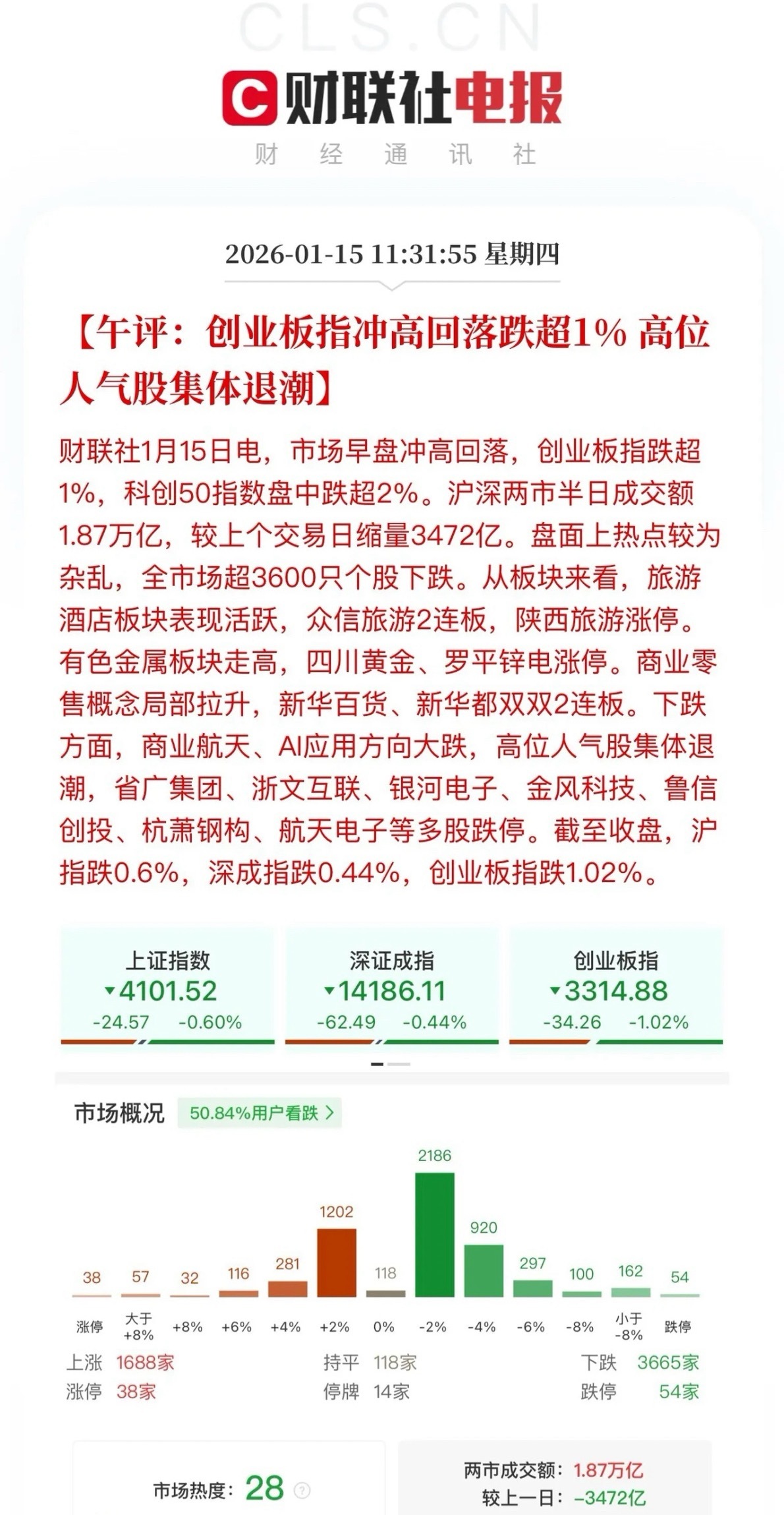 午评,题材退潮业绩股更进一步!沪深两市半日成交1.87万亿,下午若无板块大涨抢眼表现,那么预计全天成交2.5万亿!上午涨跌停比38:54肯定没法看的,但不妨碍年报主线业绩行情发酵:电池板块越走越强,固态电池、储能、能源金属大幅领先,利元亨、先导智能、海博思创、天齐锂业、赣锋锂业、永太科技、新宙邦机会都很好。存储芯片也是机会,目前是百威存储、东材科技局部发酵,但盘中也看到江波龙、德明利资金布局动作,这一条线就是去装前期新高的!端侧Ai今天大面积回撤,泓博医药跌停、因赛集团等大跌,这个方向调整下来是机会!…