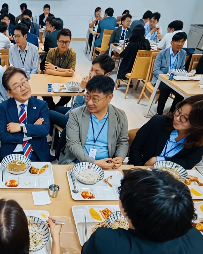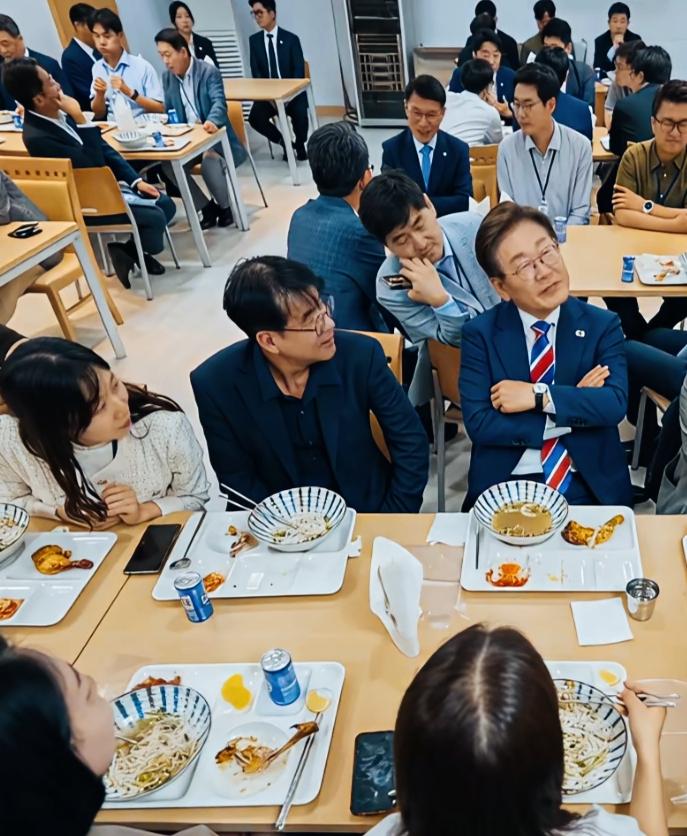 李在明这姿势是什么意思呢? 看上去像是很得意的样子啊! 歪着头在侃侃而谈吗? 这是在讲什么事情呢?