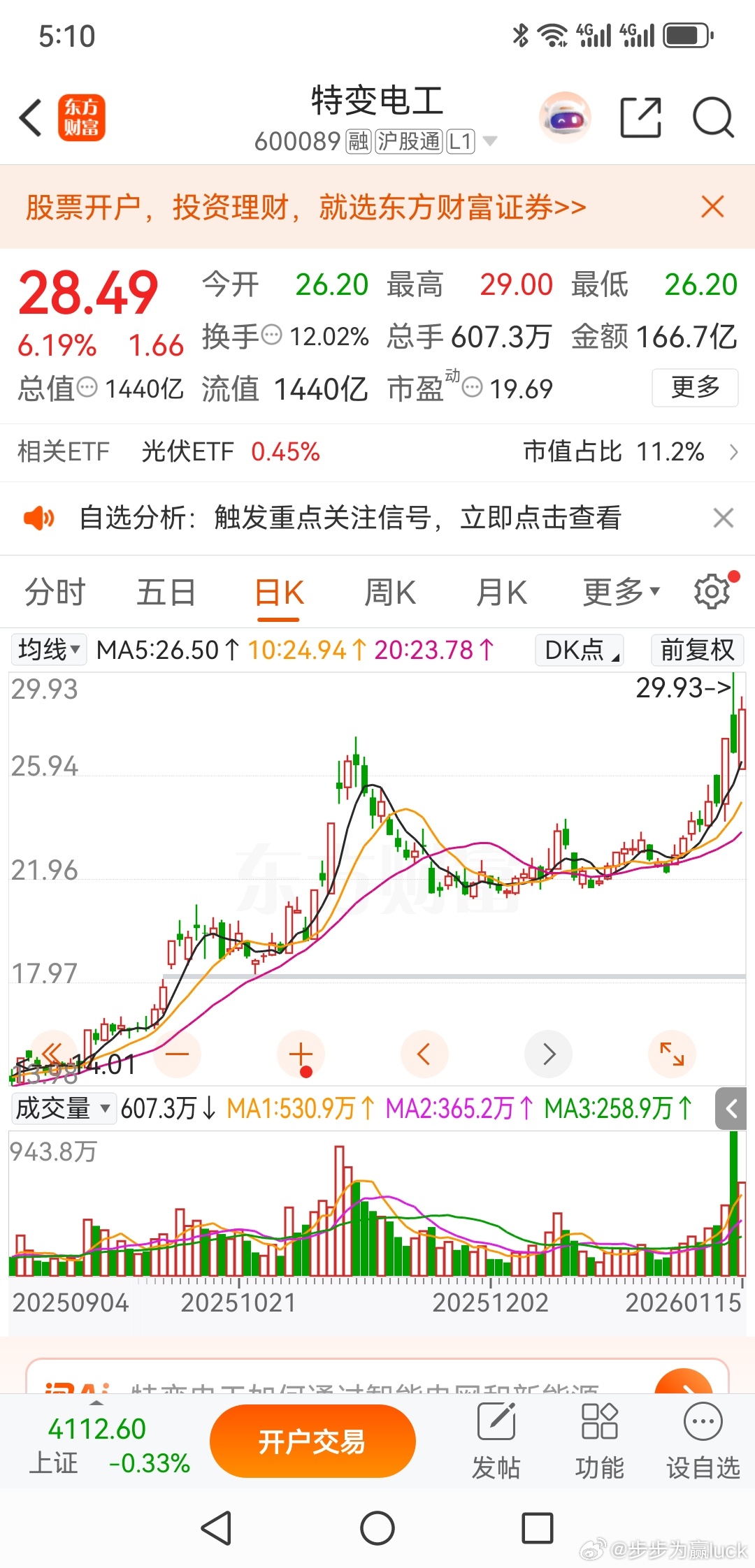 特变电工,昨天一个历史新高的巨量阴线,今天是尾盘偷袭的缩量阳线,自己评评吧!唯一合理的解释是货太多了。财经股票