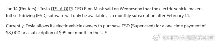FSD商业模式重大更新,停止买断,以后只有包月了Musk在X上说,2月14号以后,特斯拉FSD就停止买断了,以后只有订阅模式。以我们同事这次在美国体验FSD的实地感受,绝对合理,绝对有吸引力。目前FSD在美国单月99美金,一次性买断是8000美金。特斯拉新能源汽车