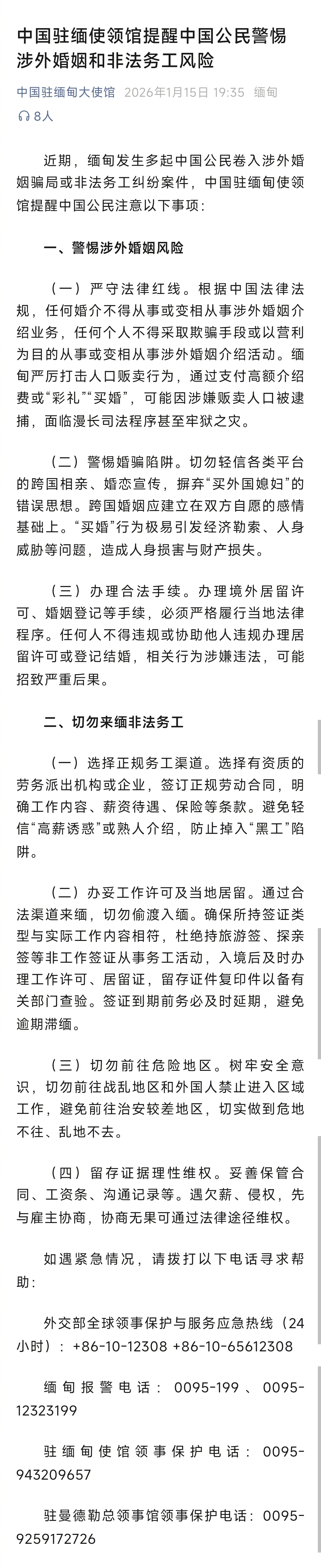 #中国驻缅使馆呼吁摒弃买婚思想#【中国驻缅甸大使馆:摒弃“买外国媳妇”的错误思想】#使馆提醒警惕缅甸婚骗风险#今日(1月15日),中国驻缅甸大使馆发文提醒,近期,缅甸发生多起中国公民卷入涉外婚姻骗局或非法务工纠纷案件,中国驻缅甸使领馆提醒中国公民注意以下事项:一、警惕涉外婚姻风险(一)严守法律红线。根据中国法律法规,任何婚介不得从事或变相从事涉外婚姻介绍业务,任何个人不得采取欺骗手段或以营利为目的从事或变相从事涉外婚姻介绍活动。缅甸严厉打击人口贩卖行为,通过支付高额介绍费或“彩礼”“买婚”,可能因涉嫌贩卖人口被逮捕,面临漫长司法程序甚至牢狱之灾。(二)警惕婚骗陷阱。切勿轻信各类平台的跨国相亲、婚恋宣传,摒弃“买外国媳妇”的错误思想。跨国婚姻应建立在双方自愿的感情基础上。“买婚”行为极易引发经济勒索、人身威胁等问题,造成人身损害与财产损失。(三)办理合法手续。办理境外居留许可、婚姻登记等手续,必须严格履行当地法律程序。任何人不得违规或协助他人违规办理居留许可或登记结婚,相关行为涉嫌违法,可能招致严重后果。二、切勿来缅非法务工(一)选择正规务工渠道。选择有资质的劳务派出机构或企业,签订正规劳动合同,明确工作内容、薪资待遇、保险等条款。避免轻信“高薪诱惑”或熟人介绍,防止掉入“黑工”陷阱。(二)办妥工作许可及当地居留。通过合法渠道来缅,切勿偷渡入缅。确保所持签证类型与实际工作内容相符,杜绝持旅游签、探亲签等非工作签证从事务工活动,入境后及时办理工作许可、居留证,留存证件复印件以备有关部门查验。签证到期前务必及时延期,避免逾期滞缅。(三)切勿前往危险地区。树牢安全意识,切勿前往战乱地区和外国人禁止进入区域工作,避免前往治安较差地区,切实做到危地不往、乱地不去。(四)留存证据理性维权。妥善保管合同、工资条、沟通记录等。遇欠薪、侵权,先与雇主协商,协商无果可通过法律途径维权。如遇紧急情况,请拨打以下电话寻求帮助:• 外交部全球领事保护与服务应急热线(24小时):+86-10-12308 +86-10-65612308• 缅甸报警电话:0095-199、0095-12323199• 驻缅甸使馆领事保护电话:0095-943209657• 驻曼德勒总领事馆领事保护电话:0095-9259172726南方都市报(nddaily)报道