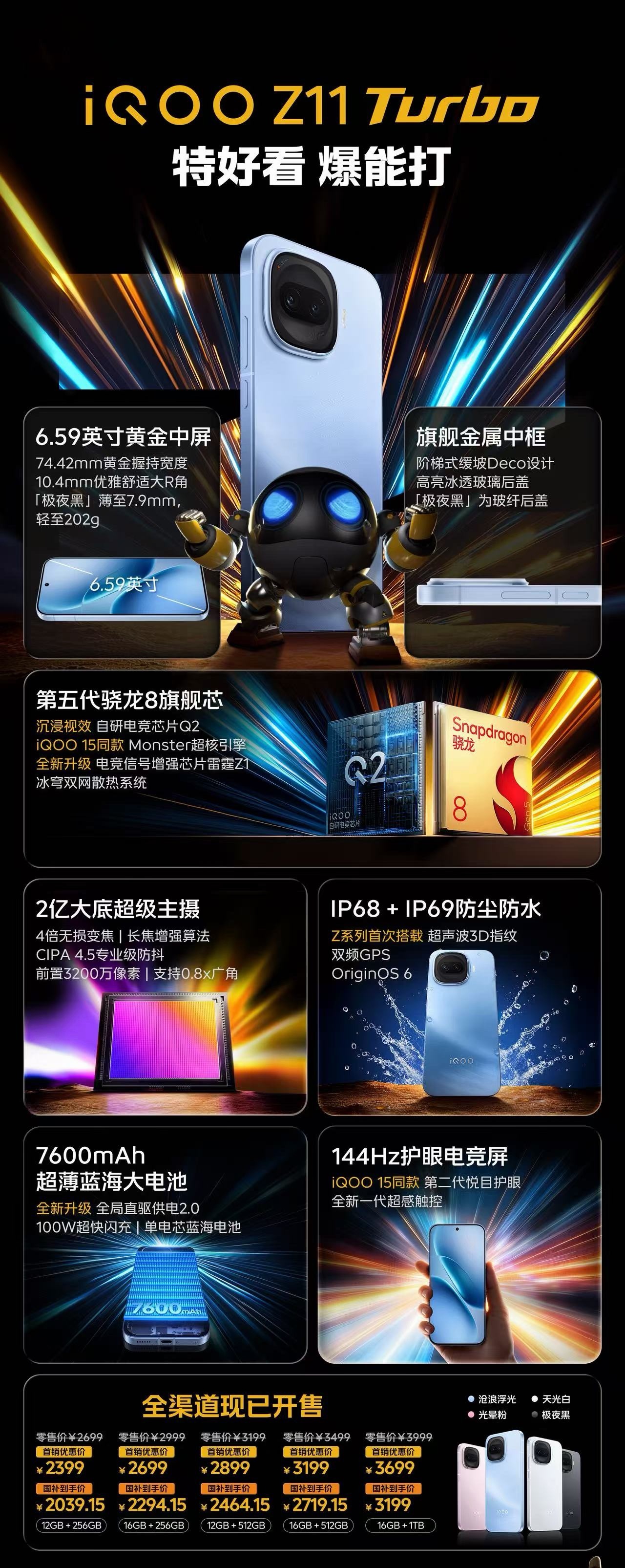 iQOO Z11 Turbo 来了~ 性能还是很强,第五代骁龙8+自研电竞芯片Q2双芯,台积电3nm制程,安兔兔跑分359.9万分;LPDDR5X Ultra+UFS 4.1存储,支持144FPS超帧+PC级纹理超分,通过KPL比赛用机认证。附以冰穹双网散热系统,核心温度直降15°C,冷热区温差≤1.8°C。屏幕方面,6.59英寸1.5K 144Hz护眼电竞屏,4320Hz超高频调光+类DC调光,5000nits户外峰值亮度,3200Hz瞬时触控采样率。2亿大底主摄(4倍无损变焦)+3200万前置7600mAh超薄蓝海大电池(第四代硅负极技术)+100W超快闪充,支持全局直驱供电2.0。金属中框+玻璃/玻纤后盖,IP68/69防尘防水,74.42mm窄机身+10.4mm大R角,拥有沧浪浮光、光晕粉、天光白、极夜黑四款配色。还有寰宇电竞网络系统2.0(24根天线+雷霆Z1芯片),公里级无网通信;超声波3D指纹、全功能NFC、红外遥控、双频GPS,预装OriginOS 6。