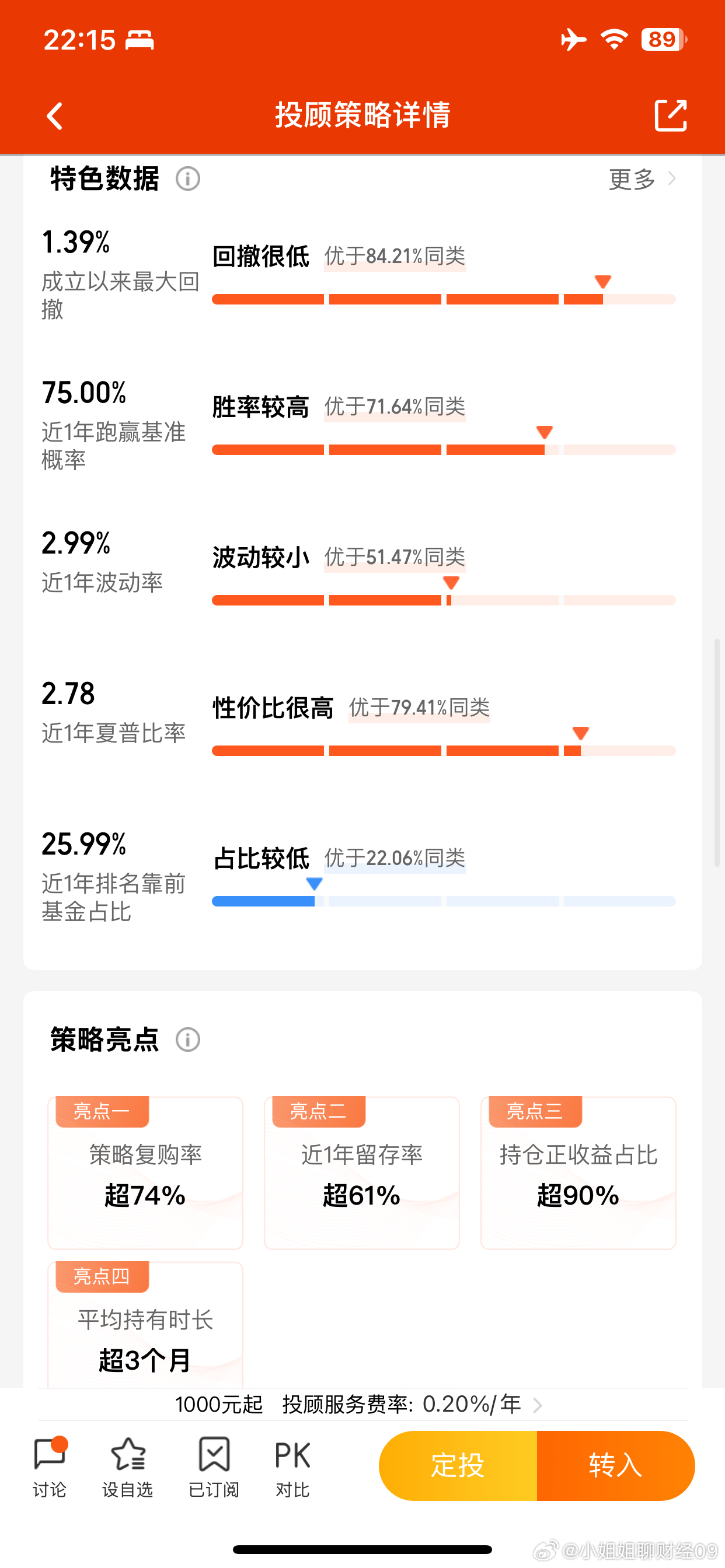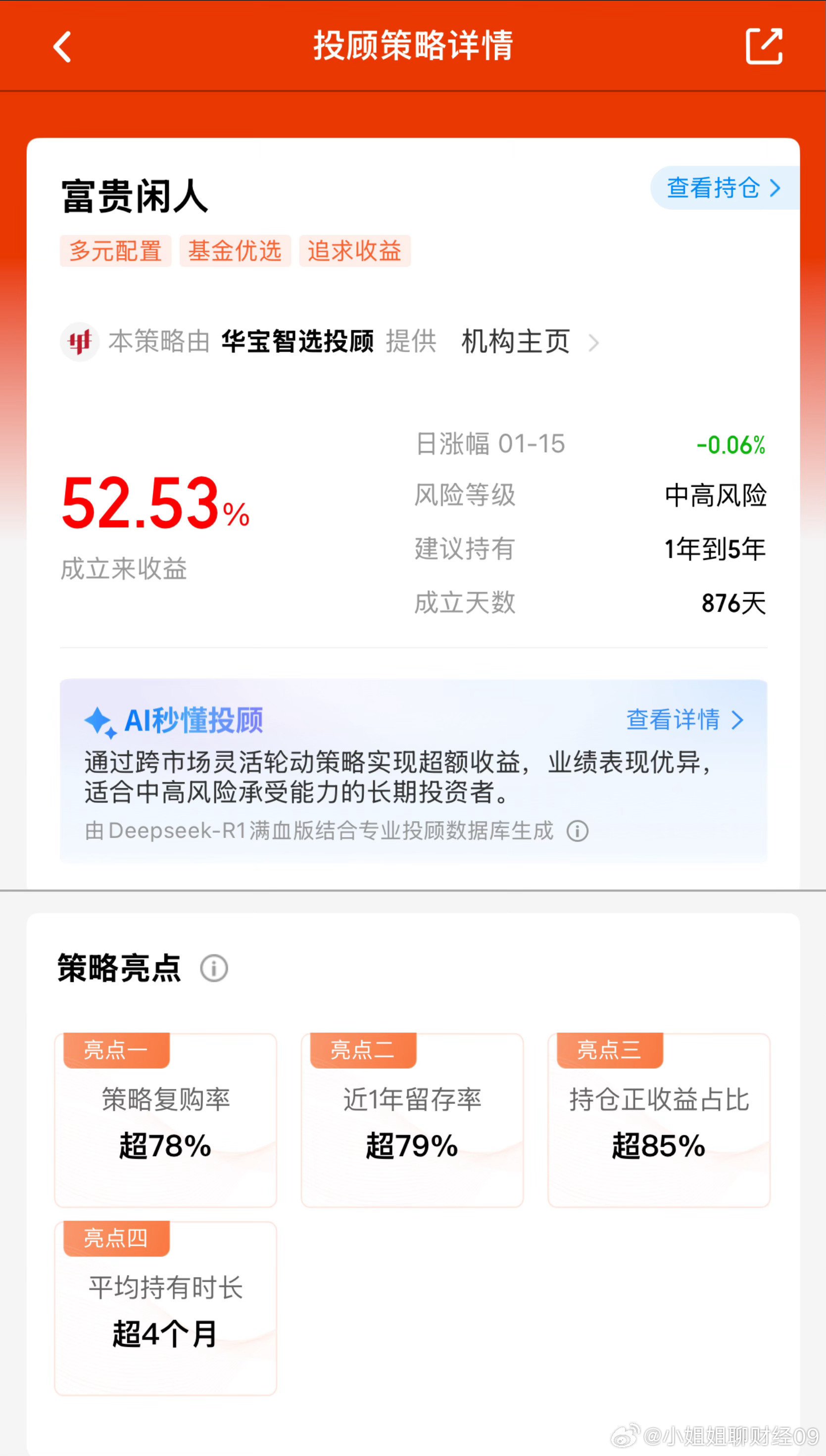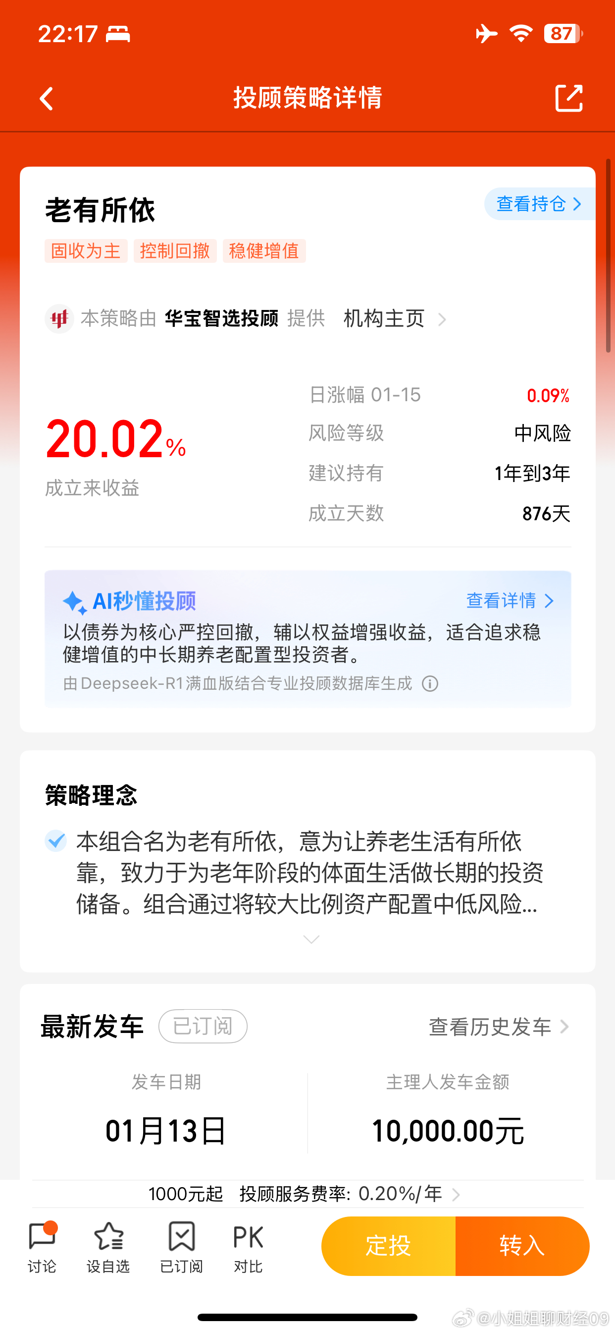 投顾跟车晒收益:富贵闲人-0.06%,老有所依+0.09%【富贵闲人】今日小跌0.06%,近一年涨39.51%,成立2年多年化回报19.99%。买入10万块,今日收益-60元,近一年赚了39510元,长期持有每年平均赚19990元。【老有所依】今日上涨0.09%,近一年上涨+9.46%,成立2年多年化回报+8.14%。买入10万块,今日收益90元,过去一年赚了9460元,长期持有每年平均赚8140元。当下行情,推荐富贵闲人和老有所依配置比例7:3或者8:2,闲钱可一笔买入,后续跟车定投,坚定持有,终有回报。跟投方法:天天基金或京东金融app,首页搜索关键词:富贵闲人,或者,老有所依。基金金融基金收益榜