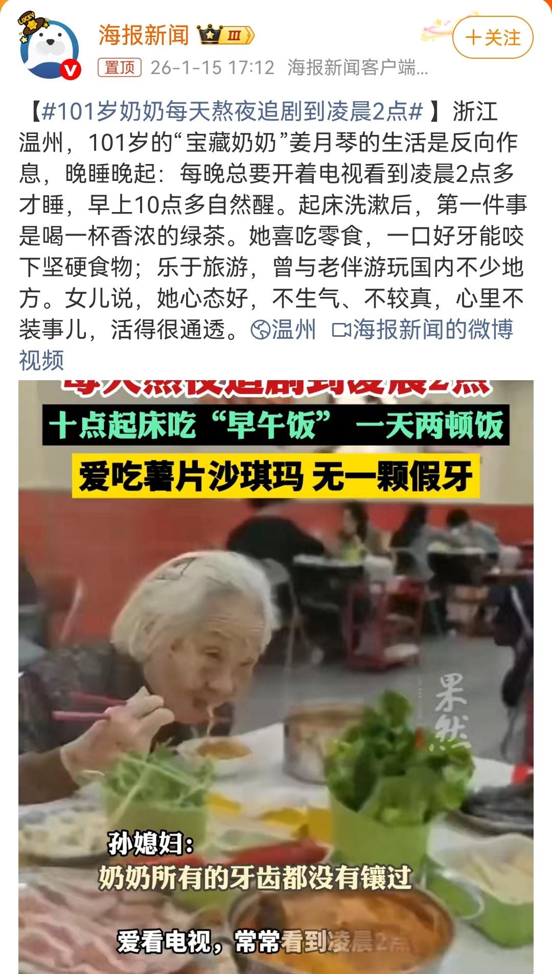 看了很多百岁老人的新闻报道,他们在饮食上差异很大,有爱吃素的,有爱吃肉的,还有爱吃零食的,也有抽烟喝酒熬夜的,没有一定的规律。 所以长寿的原因主要还是基因好,如果要找出一个共同点和每个人都能学到的长寿秘诀,那就是他们普遍心态特别好,遇事想得开,没太多烦恼。