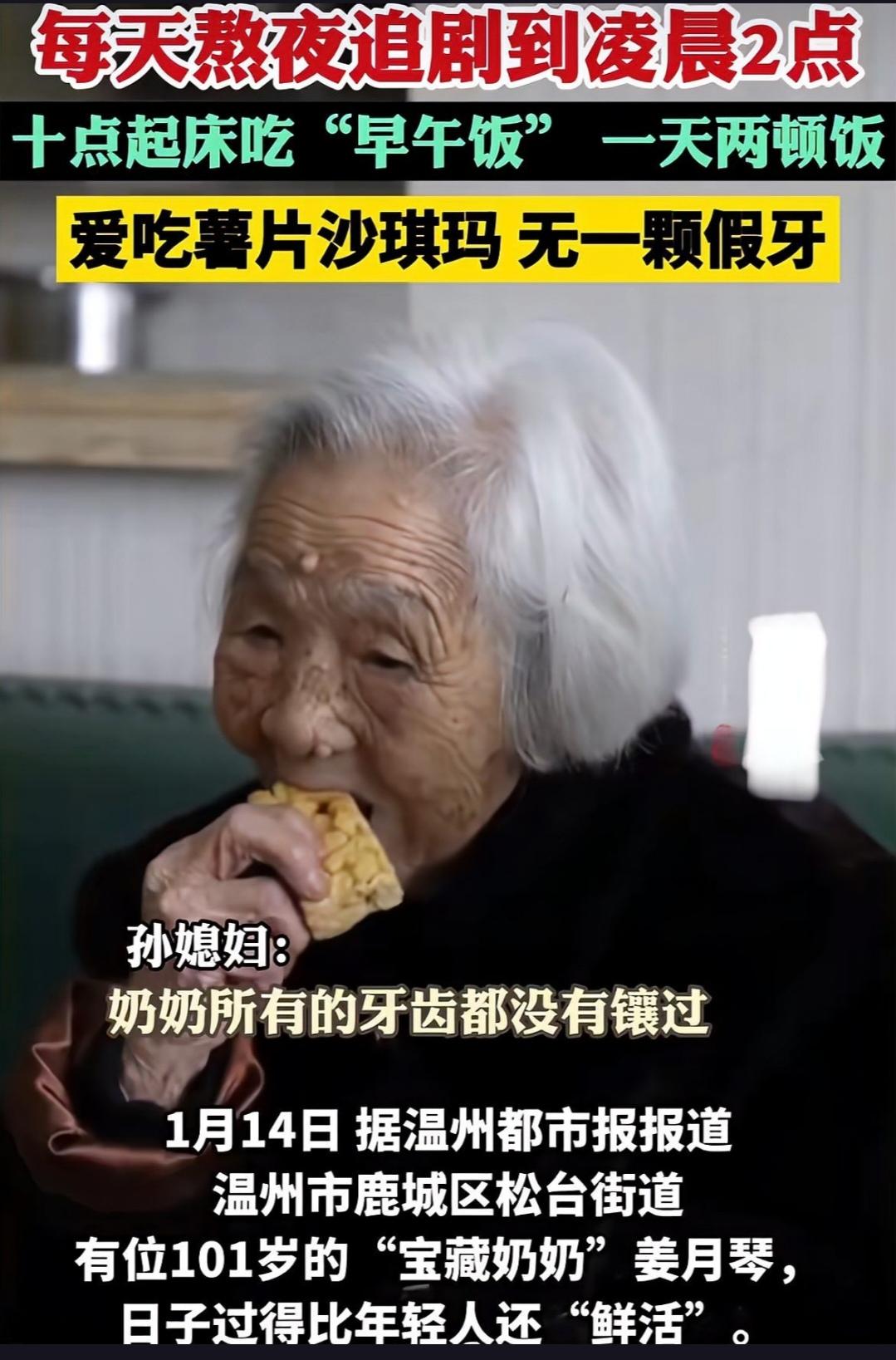 101岁高龄的姜奶奶竟然是个“夜猫子”?每天凌晨2点才睡,早上10点多才醒,这背后究竟藏着什么长寿秘诀? 在温州鹿城区松台街道,这位百岁老人姜奶奶的生活方式可谓与众不同。她每天凌晨2点才安然入睡,早上10点多便自然醒来,这种“反向作息”模式让不少人感到惊讶。然而,姜奶奶却因此享受到了更加丰富多彩的生活。她不仅睡眠充足,白天还有大把时间追剧、吃零食,甚至还能去旅行。姜奶奶的女儿姚松萍透露,母亲因为手部受伤后不再做家务,白天无所事事,便逐渐养成了晚睡的习惯。没想到,这种看似不健康的作息方式,却让姜奶奶活得如此潇洒自在。这一案例也引发了人们对老年人生活习惯的关注,难道健康长寿真的与合理的作息安排息息相关?姜奶奶的例子似乎给出了肯定的答案。 姜奶奶的“反向作息”模式让我们看到了老年人生活的另一种可能,或许健康长寿的秘诀就藏在这些看似不寻常的生活习惯中。你身边有这样的长寿老人吗?他们的生活习惯又是怎样的呢?快来评论区分享你的故事吧!高寿老奶奶 100岁的老人 老人家的作息