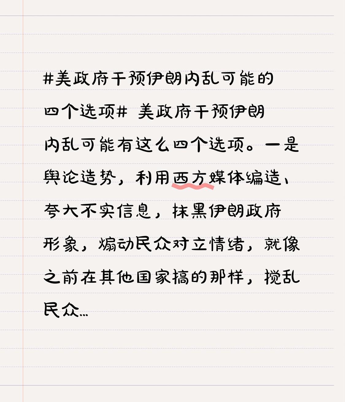 美政府干预伊朗内乱可能有这么四个选项。一是舆论造势,利用西方媒体编造、夸大不实信息,抹黑伊朗政府形象,煽动民众对立情绪,就像之前在其他国家搞的那样,搅乱民众思想。二是经济制裁加码,进一步限制伊朗的石油出口、金融交易等,让伊朗经济雪上加霜,迫使政府就范。三是扶持反对派,给伊朗国内反对势力提供资金、武器和培训,让他们充当美国的“马前卒”,制造混乱。四是军事威慑,派遣航母、战机到伊朗周边海域和空域,进行军事演习等行动,给伊朗政府施压。不过伊朗也不是好惹的,美政府这些招数能不能得逞还真不好说。