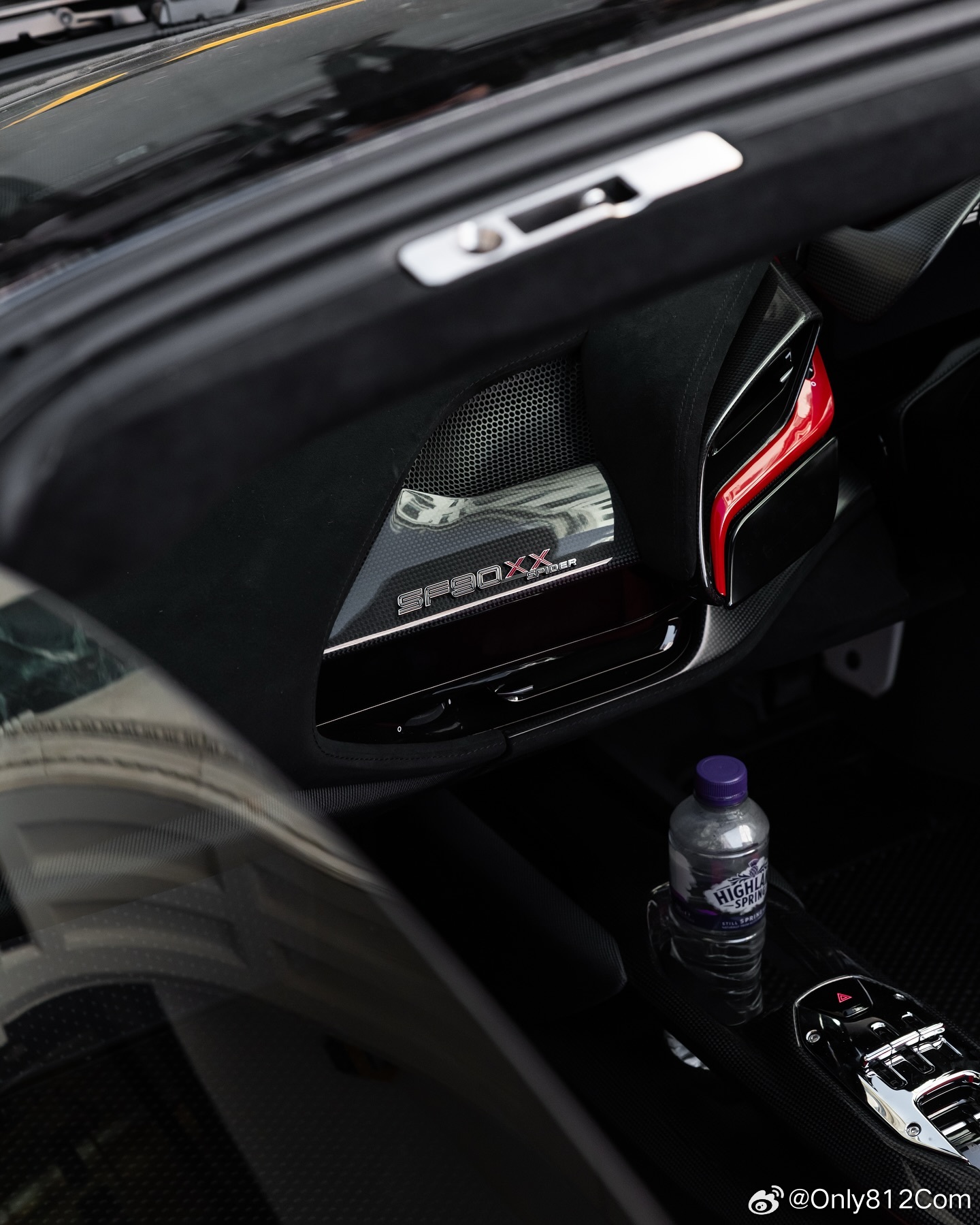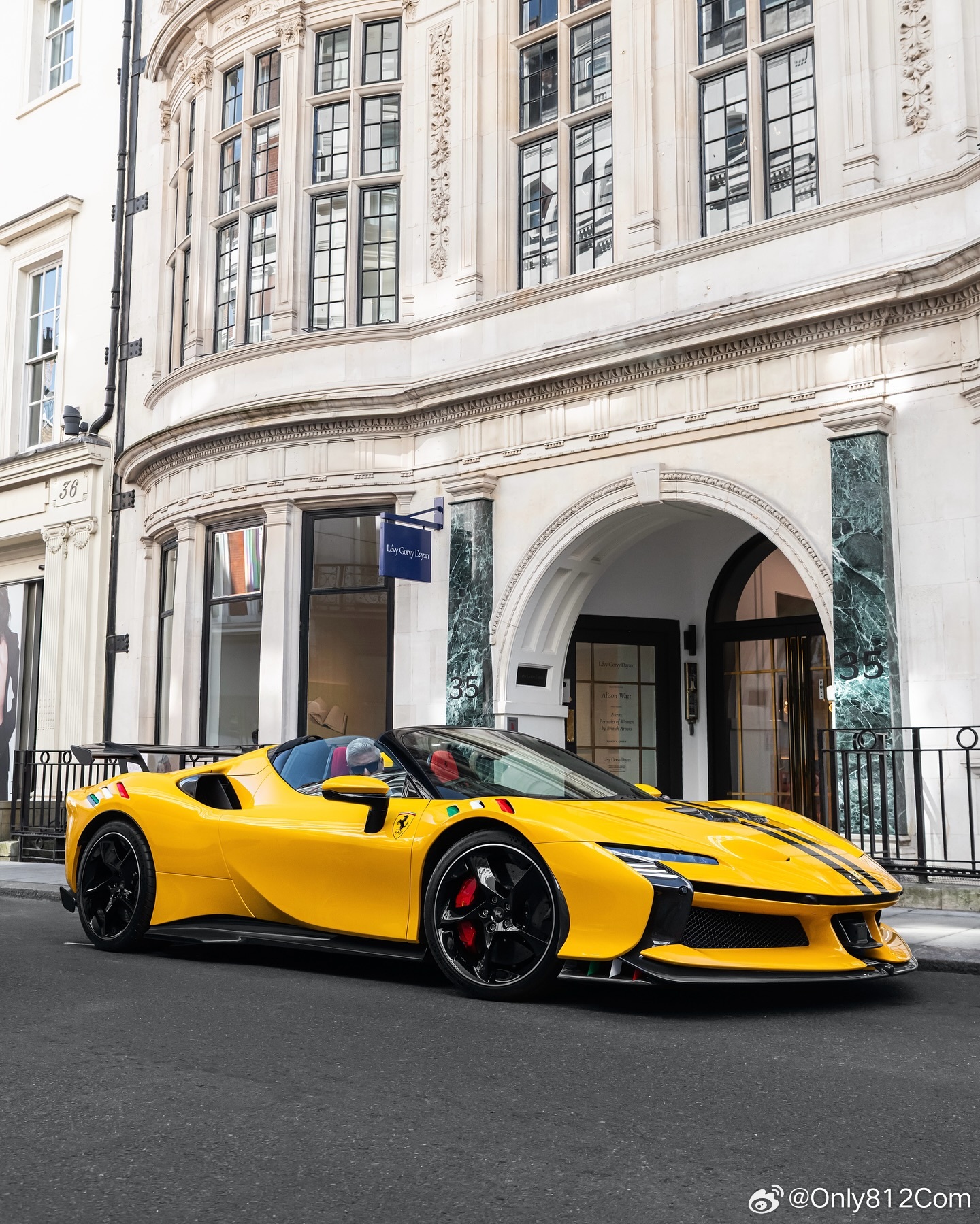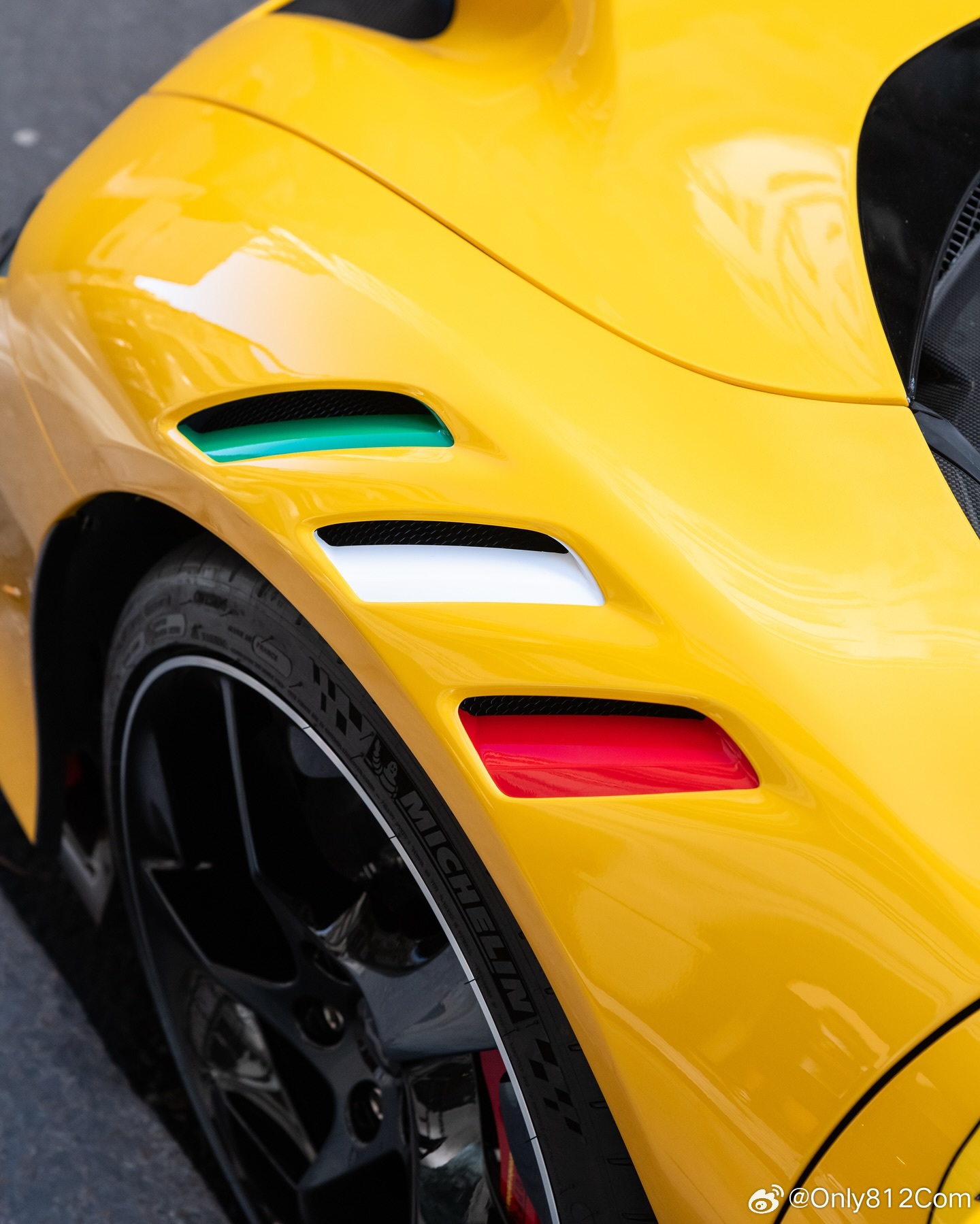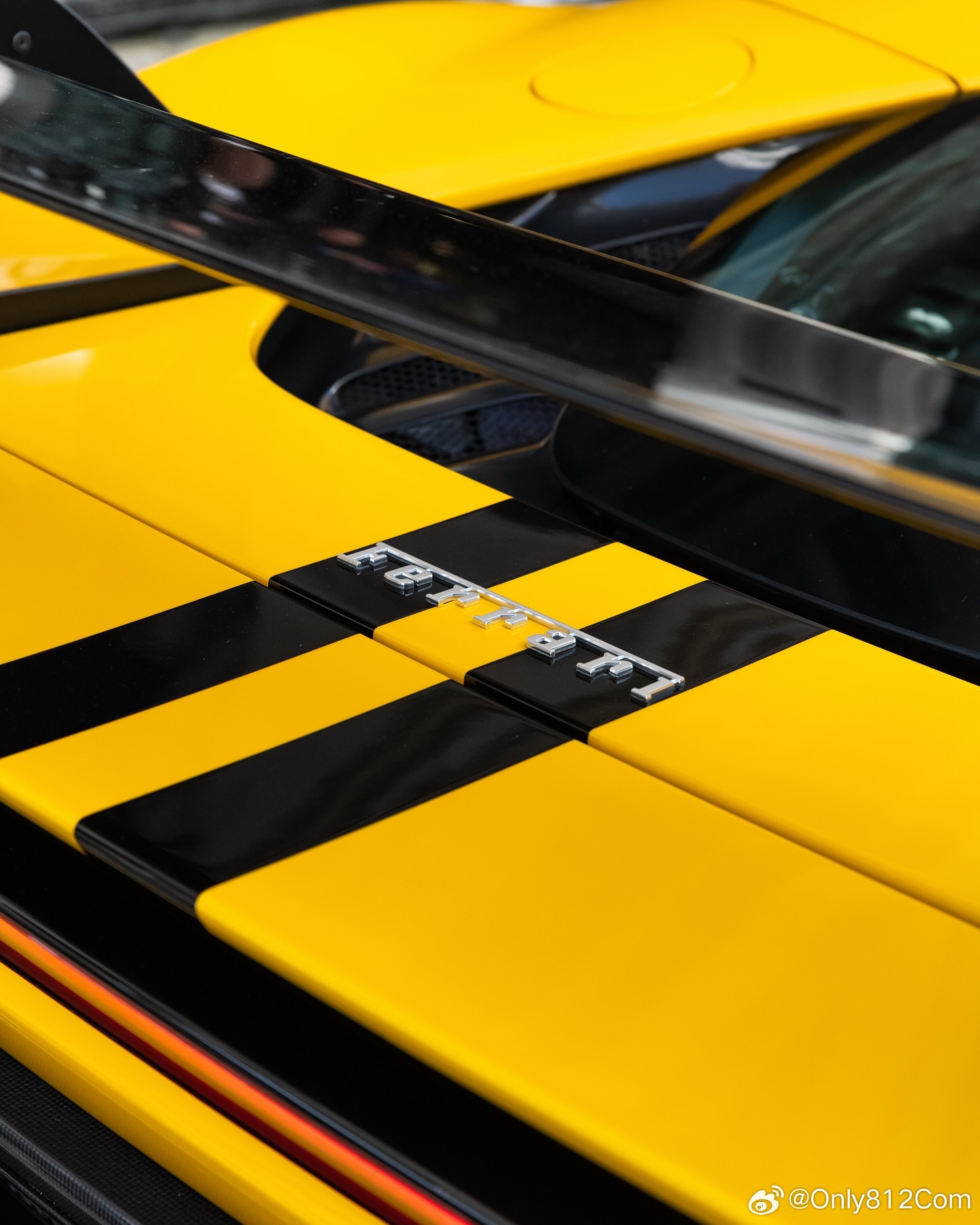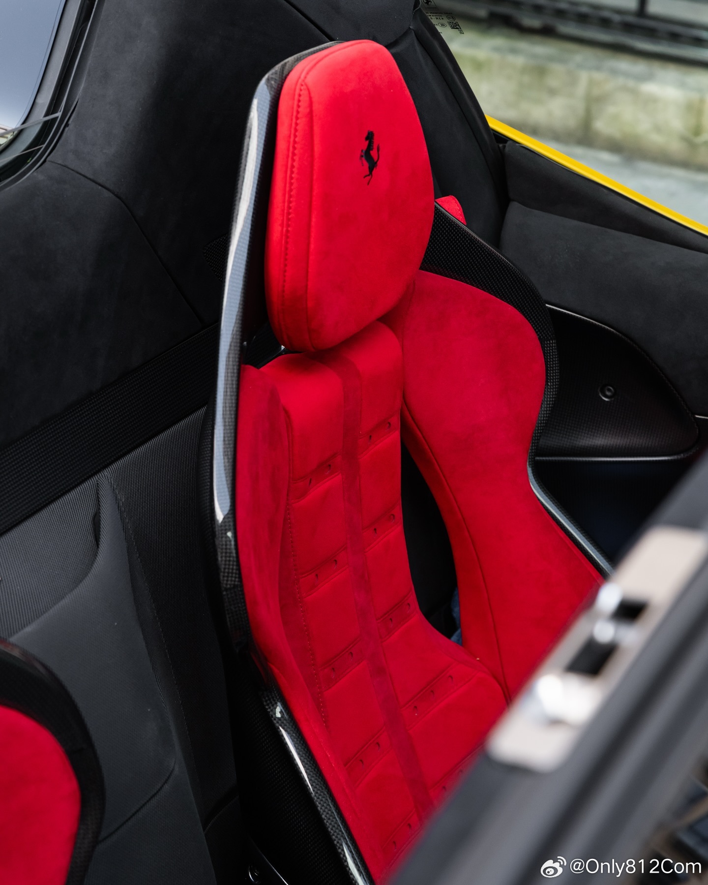 外观配色为Ardilla Amarillo,翻译成中文为松鼠黄,是一款与Giallo Triplo Strato类似,但是个人认为看起来不如后者厚重,没有很重的颗粒感的一款黄色,车主的812 Competizione也选择了这款颜色。外观方面选配了两条Nero DS的赛车拉花,此外还选择了漆盾。内饰方面,Daytoba复古赛车座椅使用了Rosso FX Ferrari Alcantara,内饰部分细节使用了Rosso Corsa点缀。交付于位于英国伯明翰的Graypaul Ferrari Birmingham,应该是这家经销商的第一台SF90 XX Spider。图片来自