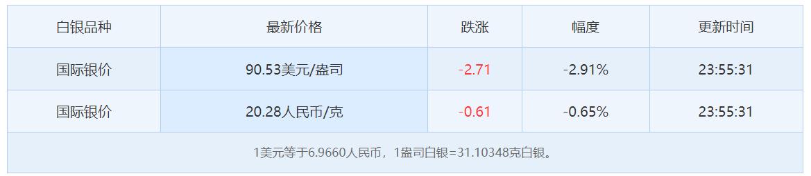 近期白银价格波动比较剧烈, 特别是今日高开低走, 上下波动七八美元。 现货白银报价90.53美元, 较上一日下跌2.71美金, 跌幅明明缩小,仅为2.91%。 我们知道1美元等于6.9660人民币, 1盎司白银=31.10348克白银。 简单折算成人民币, 白银价格就是20.28人民币/克。 不过大家在购买银饰或者制品时, 价格会因为设计、工艺和品牌 等因素有所不同,另外银价也是每天变化的。