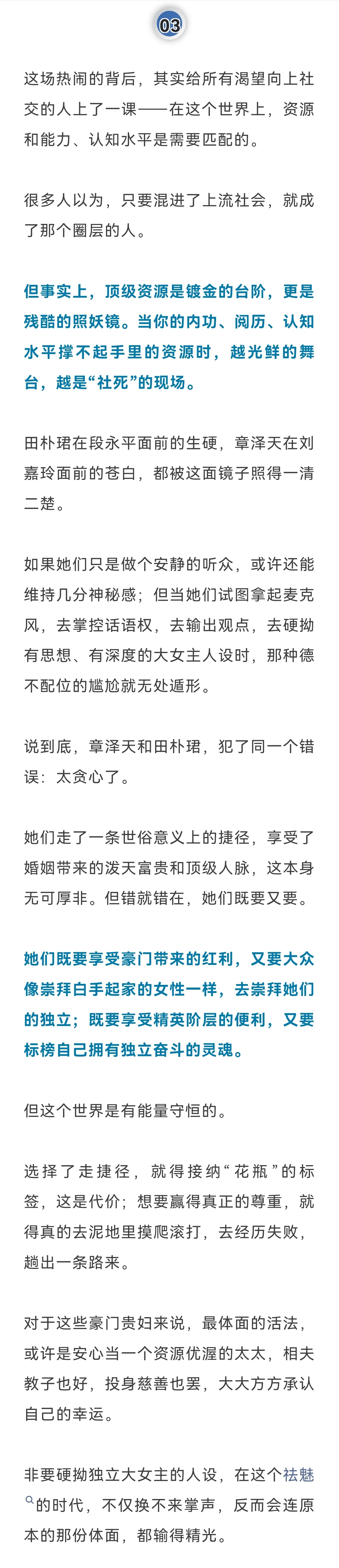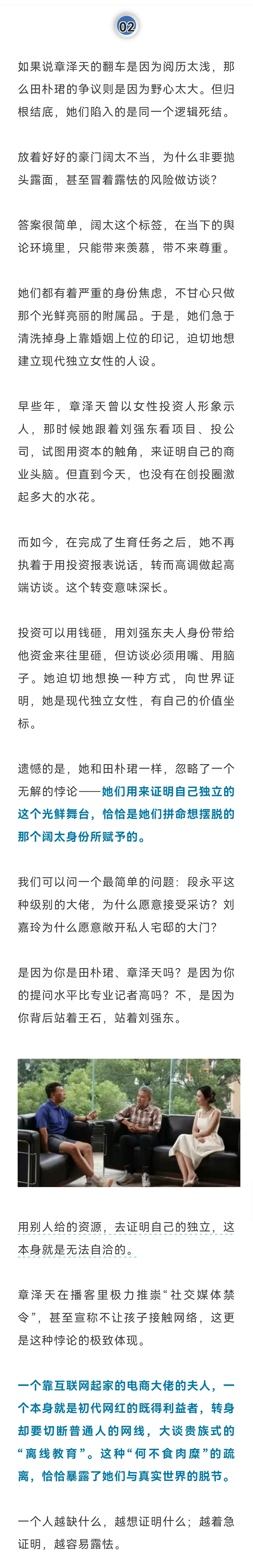 章泽天的首期播客节目《小天章》,面对刘嘉玲时的稚嫩与悬浮,被群嘲为把一场高手过招,聊成了名媛下午茶。此前,田朴珺在节目《共同说》对话了商业教父段永平。两位相差十岁的顶级贵妇,都试图通过高端访谈来撕掉“花瓶”标签,塑造一个有思想、有深度的独立女性形象。章泽天想通过《小天章》,剥离掉“奶茶妹妹”的网红标签,也想卸下“刘强东夫人”的商业符号,还原一个“小天”的本真自我。然而,“奶茶妹妹”依然是那个被保护得很好的小女孩。章泽天和田朴珺都忽略了一个无解的悖论,她们用来证明自己独立的这个光鲜舞台,恰恰是她们拼命想摆脱的那个阔太身份所赋予的。用别人给的资源,去证明自己的独立,这本身就是无法自洽的。她们既要享受豪门带来的红利,又要大众像崇拜白手起家的女性一样,去崇拜她们的独立;既要享受精英阶层的便利,又要标榜自己拥有独立奋斗的灵魂。