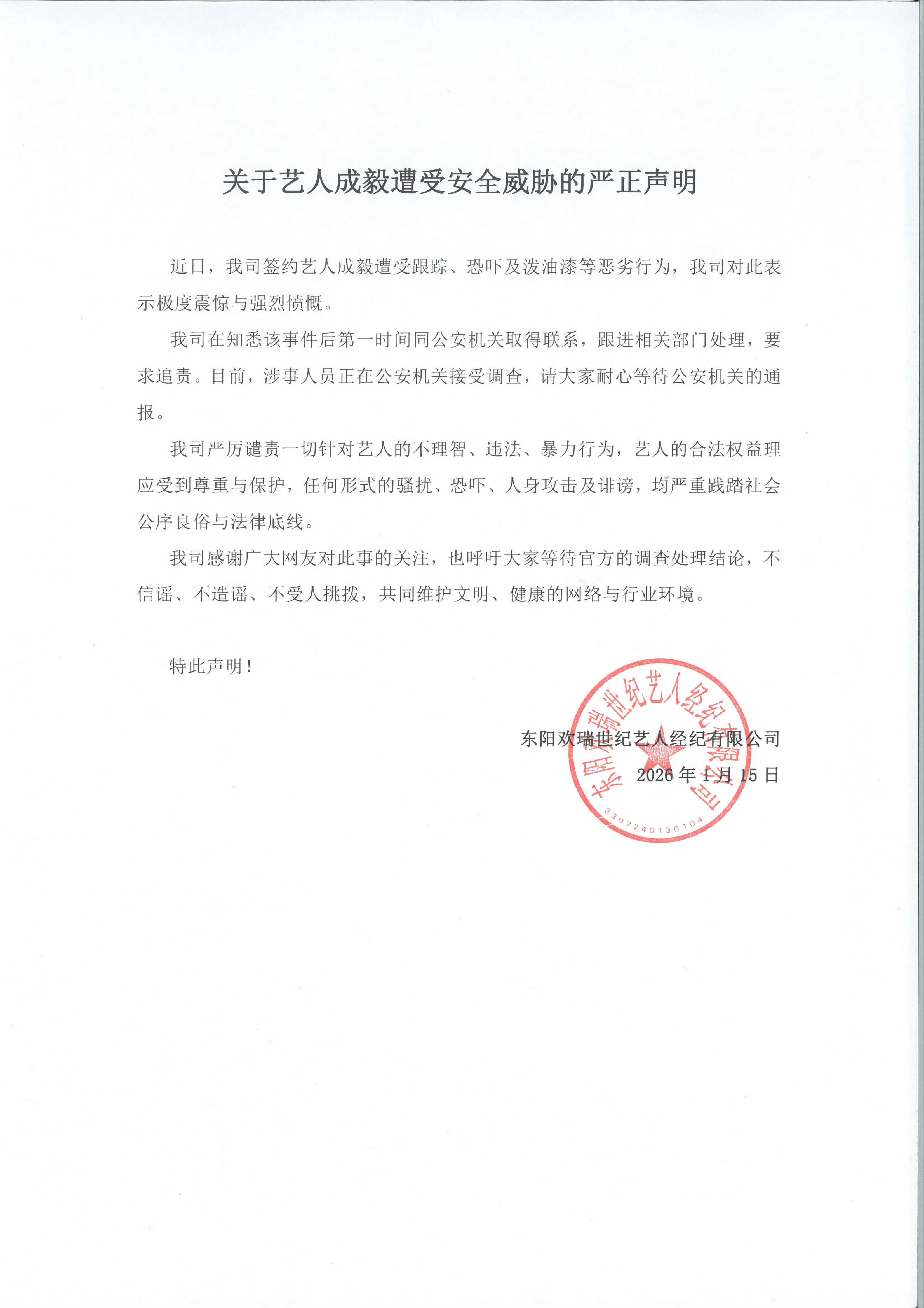 欢瑞经纪发了关于成毅遭受安全威胁的严正申明。