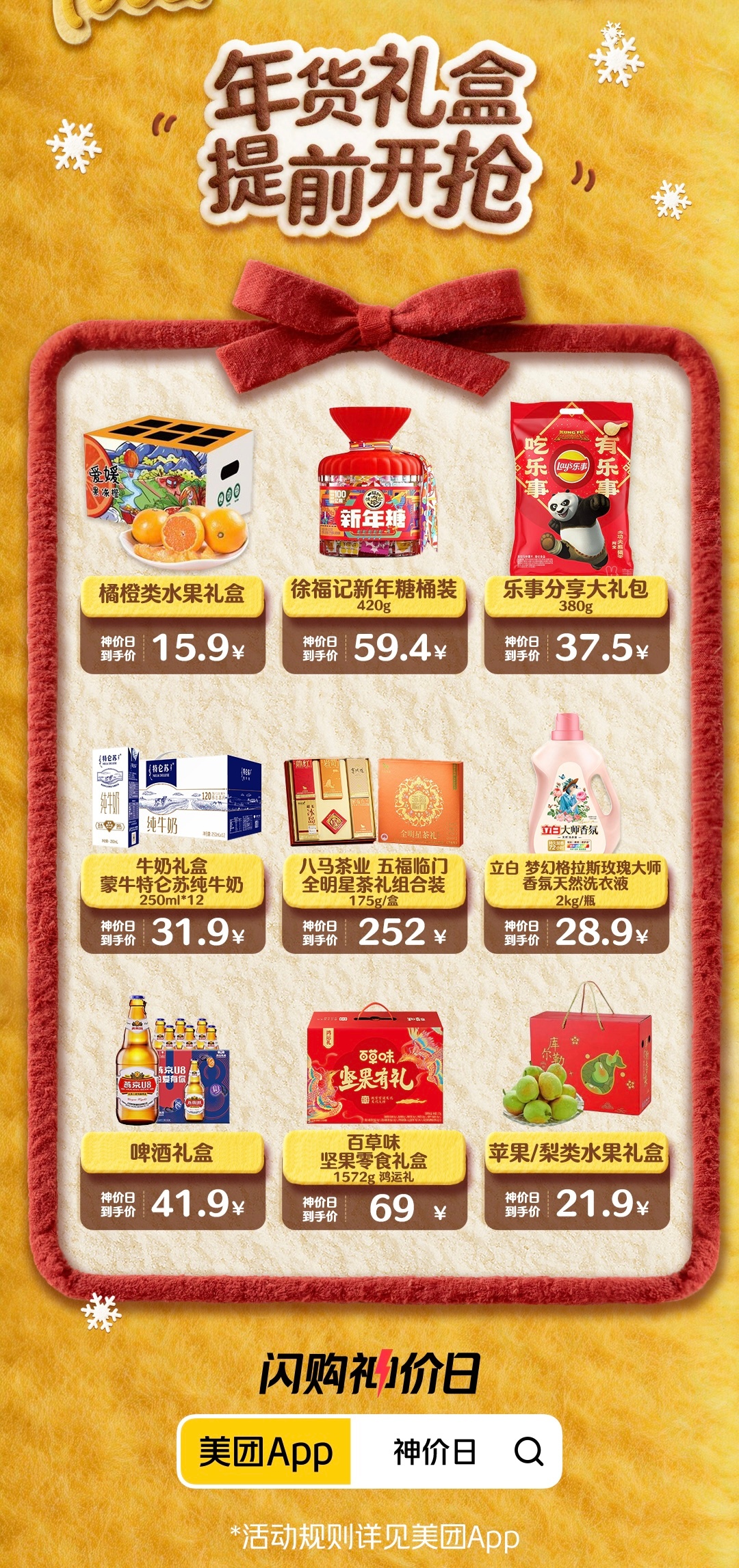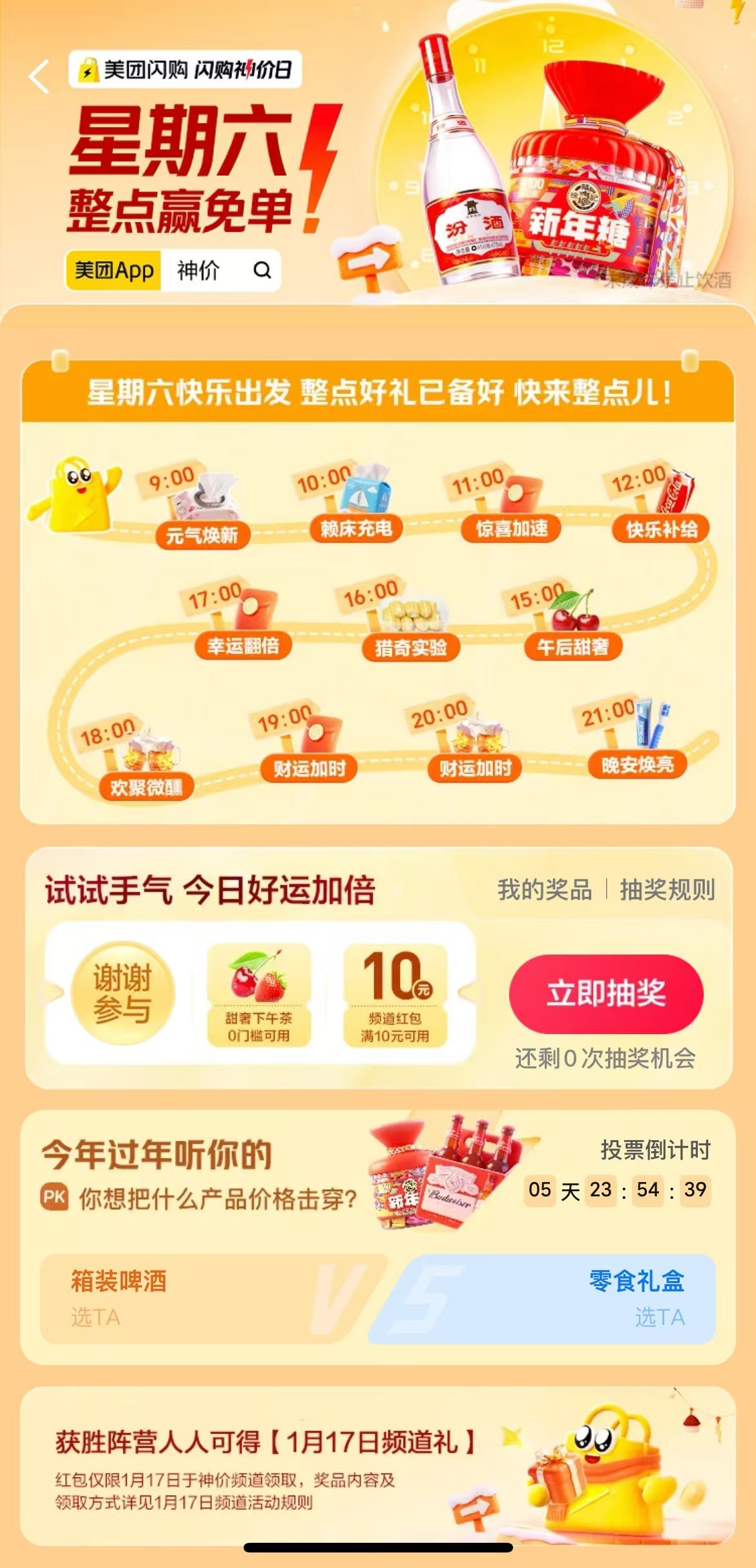 这泼天的富贵终于轮到我了!就是今天,美团闪购星期六神价日整点赢免单,羊毛党快来!还有超多价格超低的爆品好物,水果、饮料、生活用品等你来!更有年货礼盒提前购,过年更从容!是时候做好囤货准备了。快点打开美团App,搜索🔍【神价日】,家人们赶紧冲,星期六的这种快乐不能我一个人独享😂美团闪购神价日美团闪购神价日整点赢免单