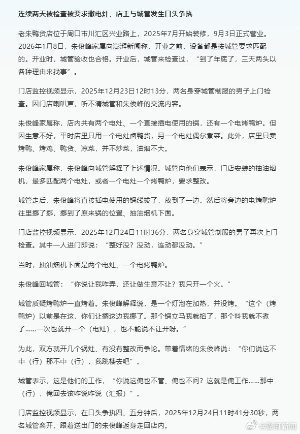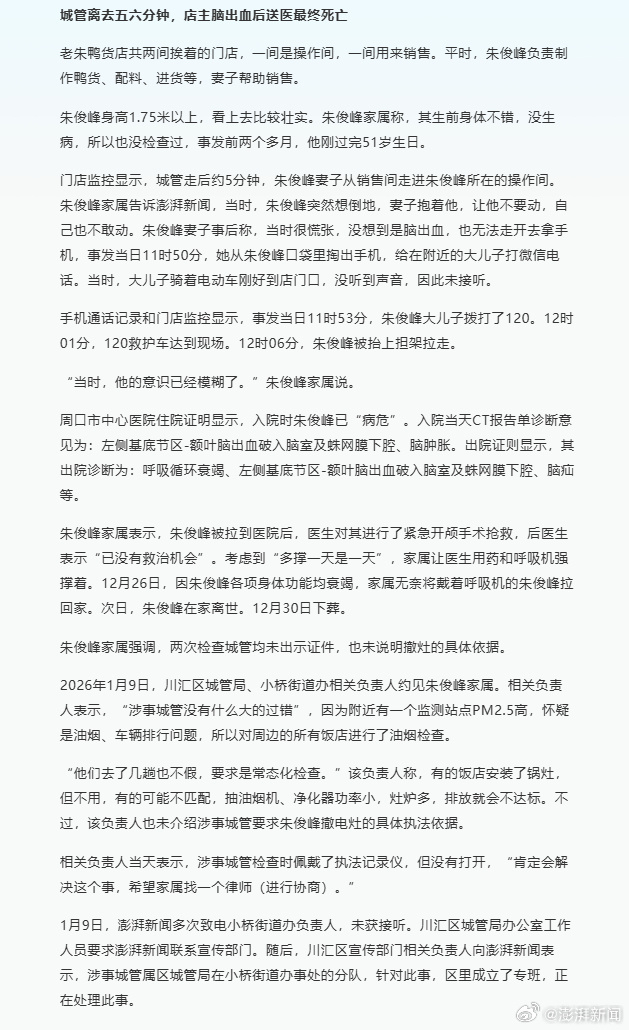 当地回应店老板和城管争论后晕倒死亡【周口一鸭货店老板和城管发生争论后因脑出血死亡,当地成立专班处理】 2025年12月24日,河南周口市川汇区的城管执法人员上门对老朱鸭货店进行环保检查,要求其撤电灶,51岁的老板朱俊峰与城管发生争论。城管离开后约5分钟,朱俊峰晕倒,后送医抢救,最终因脑出血宣告不治。朱俊峰家属质疑,鸭货店开业时,城管验收也都合格。开业后城管检查也没说“这不中(行)那不中(行)的”。事发当天和前一天,城管两次上门,均未提供要求撤灶的具体依据。2026年1月9日,周口市川汇区官方向朱俊峰家属表示,因为附近有一个监测站点PM2.5数据高,怀疑是油烟、车辆排放问题,所以对周边饭店进行了油烟检查。1月9日,澎湃新闻多次致电小桥街道办负责人,未获接听。川汇区城管局办公室工作人员要求澎湃新闻联系宣传部门。随后,川汇区宣传部门相关负责人向澎湃新闻表示,涉事城管属区城管局在小桥街道办事处的分队,针对此事,区里成立了专班,正在处理此事。