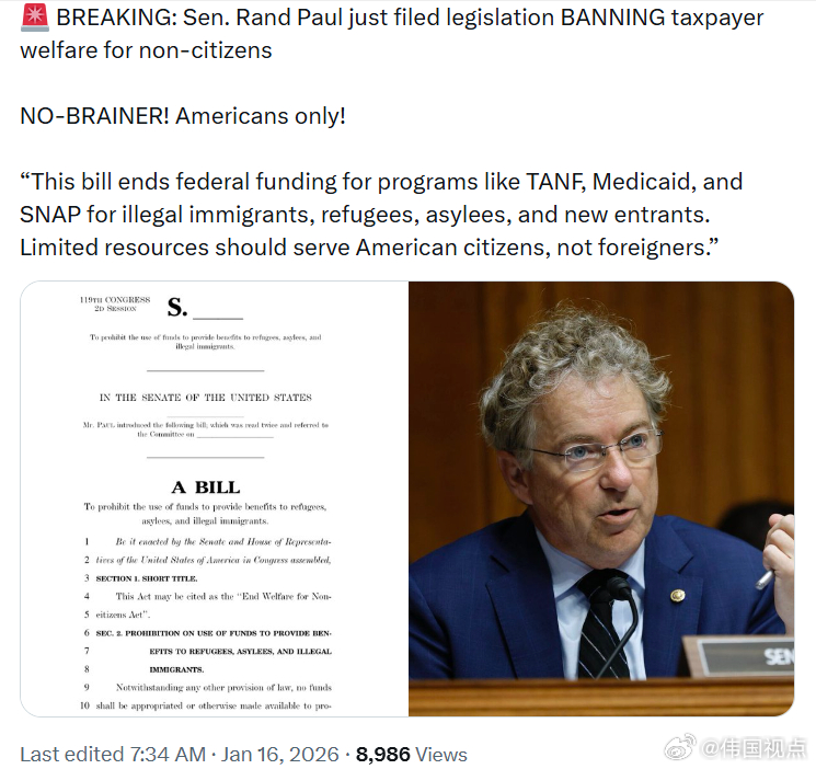 联邦参议员 兰德·保罗刚刚提交法案,禁止用纳税人的钱为非公民提供福利。“这项法案将终止对非法移民、难民、寻求庇护者以及新入境者的TANF、Medicaid和 SNAP等联邦项目的资助。有限的资源应该服务于美国公民,而不是外国人。”