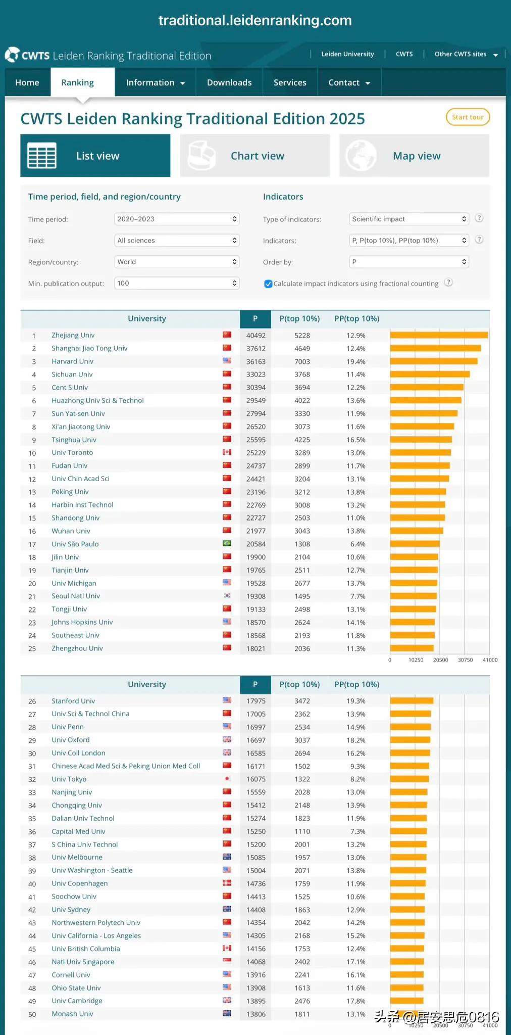 2025年科研表现全球大学排名(莱顿大学评):浙大、上海交大、哈佛大学、四川大学、中南大学、华中科大、中山大学、西安交大、清华、多伦多大学、复旦、中国科学院大学、北大、哈工大、山东大学、武汉大学、圣保罗大学、吉林大学、天津大学、密歇根大学、首尔大学、同济、霍普金斯、东南大学、郑州大学