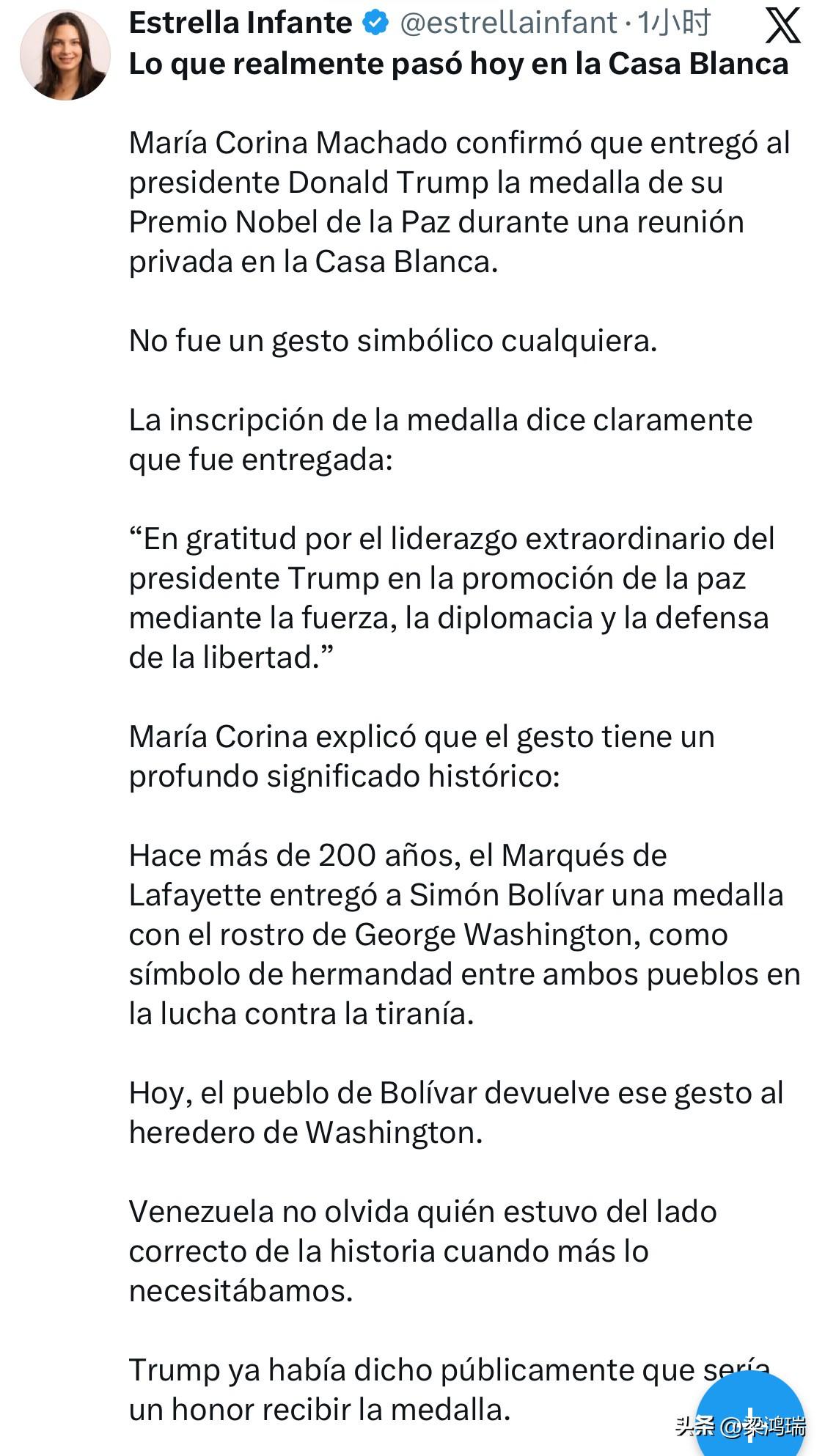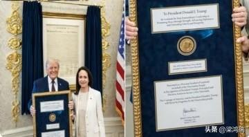 委内瑞拉反对派领导人玛丽亚·科里纳·马查多 (María Corina Machado) 将她的诺贝尔和平奖奖章赠送给唐纳德·特朗普 (Donald Trump)。 马查多在白宫的一次会晤中向特朗普赠送了这枚奖章,以表彰他对“自由”的独特承诺。 该奖章被装在一个相框内,上面刻有献词,写着“致唐纳德·J·特朗普总统”。 背景墙上挂着一幅乔治·华盛顿的肖像画 和一份《独立宣言》的复制品。 马查多将此举比作拉法耶特将军赠送给西蒙·玻利瓦尔一枚带有乔治·华盛顿头像的奖章的历史时刻。