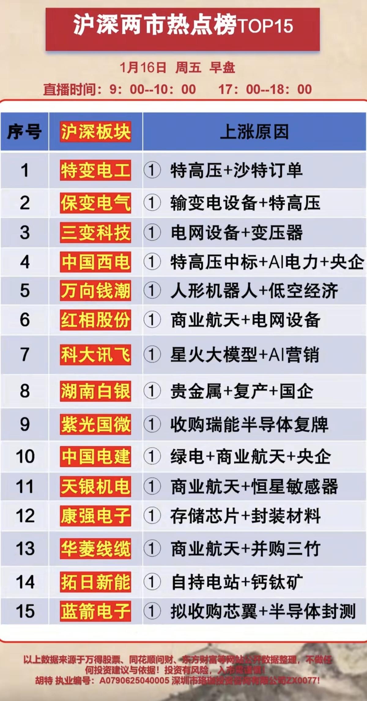 1.16周五 人气股热榜+大资金抢筹动向 ! 大资金抢筹热点: 1.智能电网 2.半导体芯片 3.新能源车 4.特高压,高宽带存储