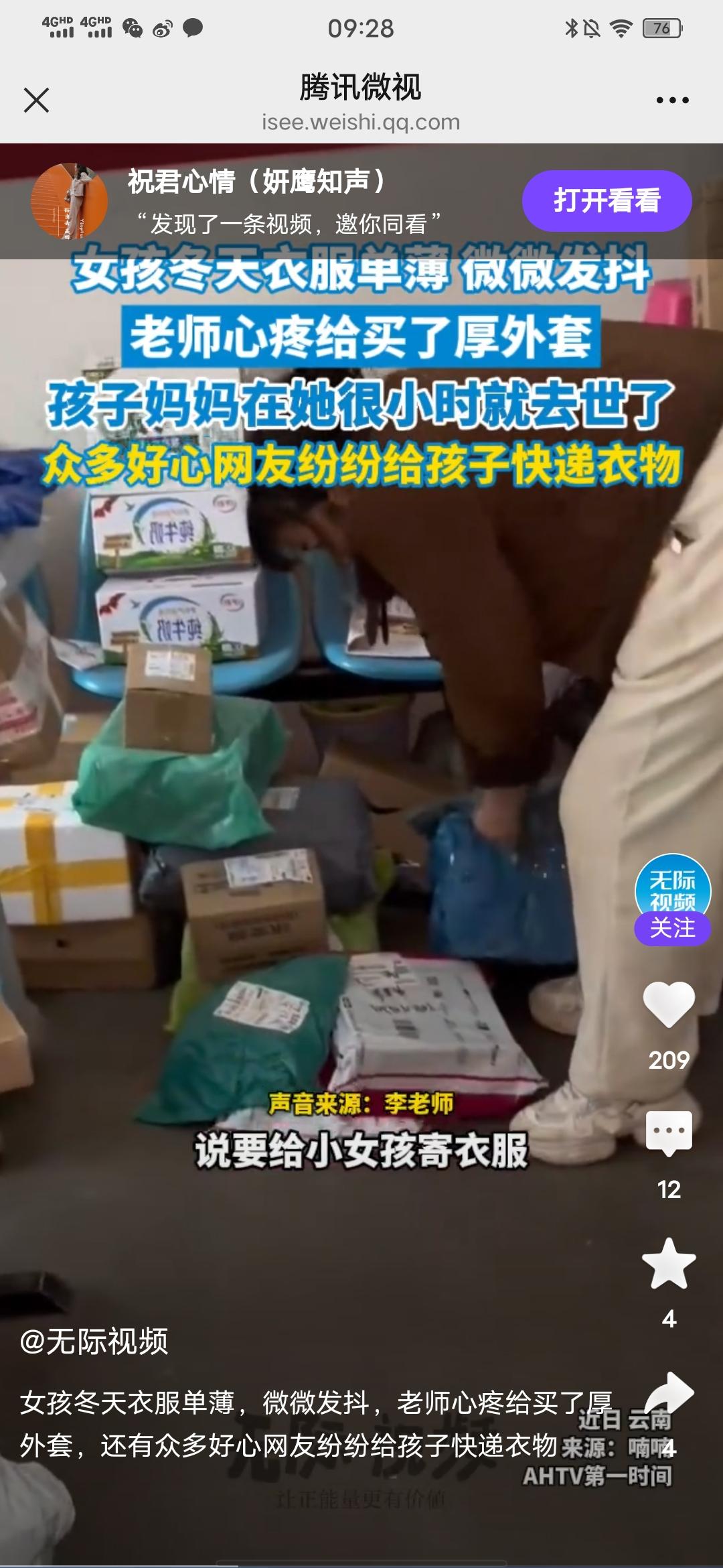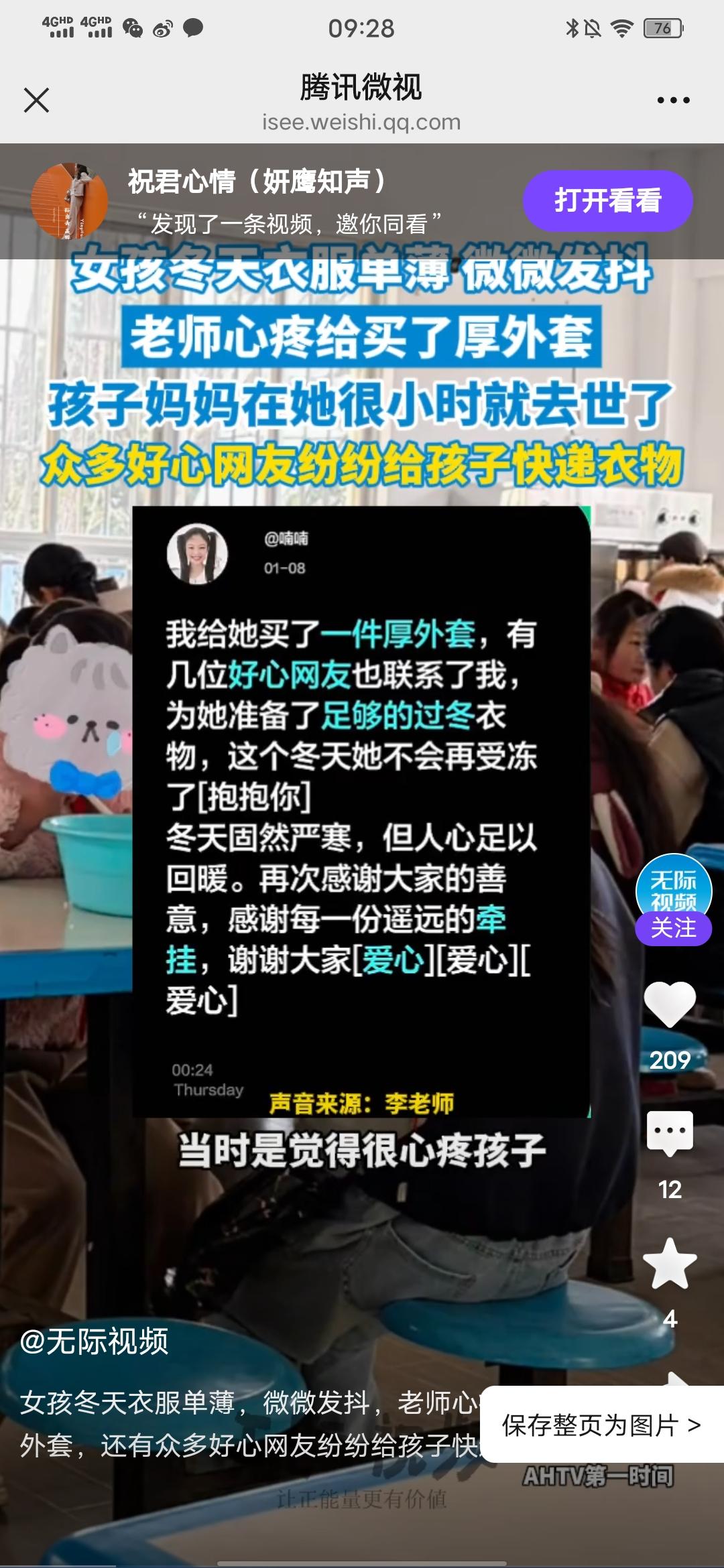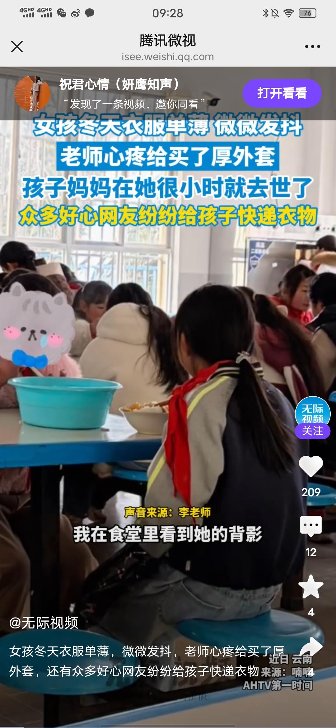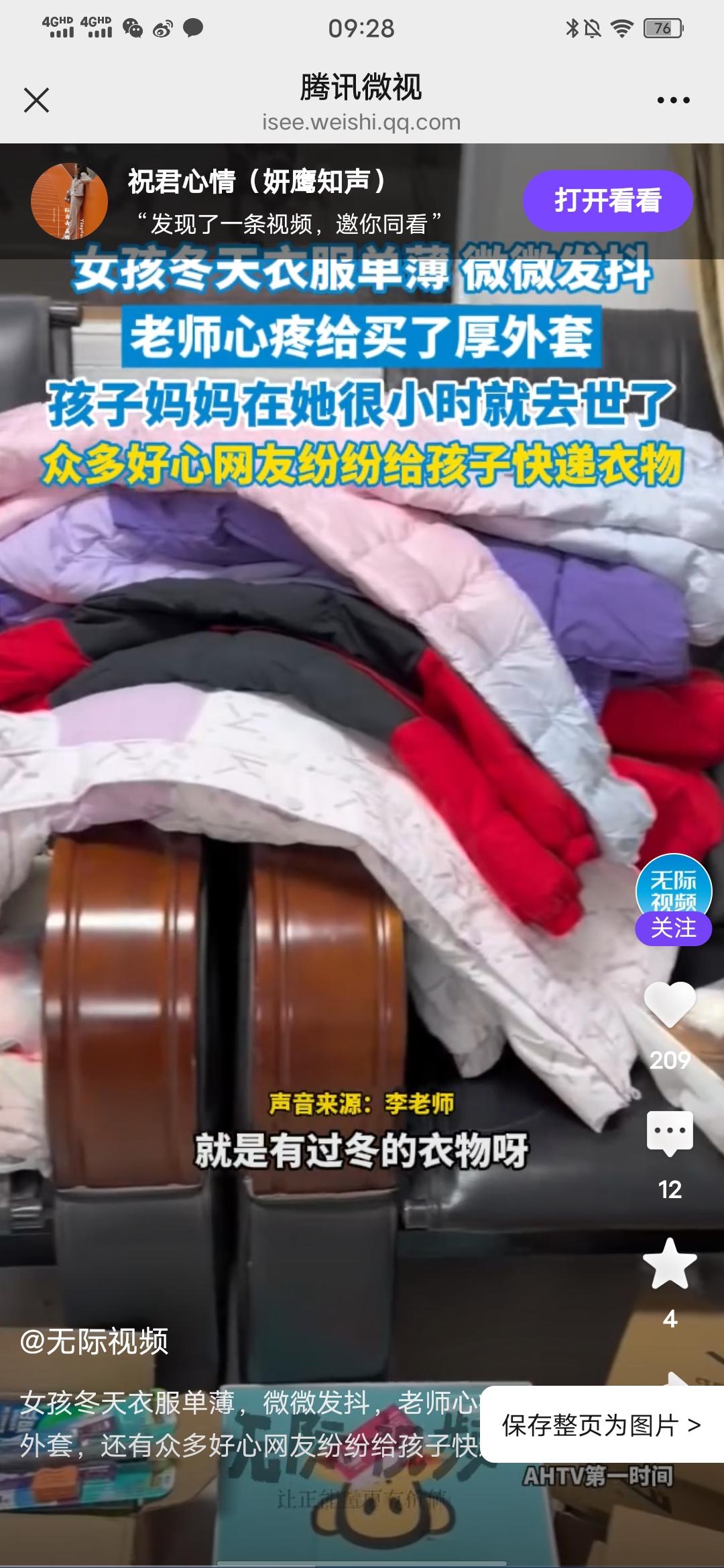 女孩冬天衣服单薄,冷得微微发抖,老师心疼给买了厚外套,还有众多好心网友纷纷给孩子快递衣物! 刚在无际视频看到的消息,近日,一位教英语的李老师,去食堂吃饭时,看到自己的一个学生,衣服很单薄,当天还在下雪,这个女孩子冷得微微发抖,看到这一幕,她很心疼,就给这孩子买了厚外套,并发了个照片到网上,结果好多网友纷纷给孩子快递衣物,日用品等,有的还表示可以支助孩子学费。 然后网友们寄得东西比较多,而且李老师班上还有几个家庭贫困的孩子,她征求网友们同意后,将多的衣服又分给了其他班里的几个孩子。 这件事真的很温暖人心,这个孩子今年冬天不会再冷了,不仅身上暖,心里更暖,这孩子遇到了好老师,也遇到了好心人,孩子还写了感谢的小文章,真的是双向奔赴的温暖,祝愿好人一生平安!
