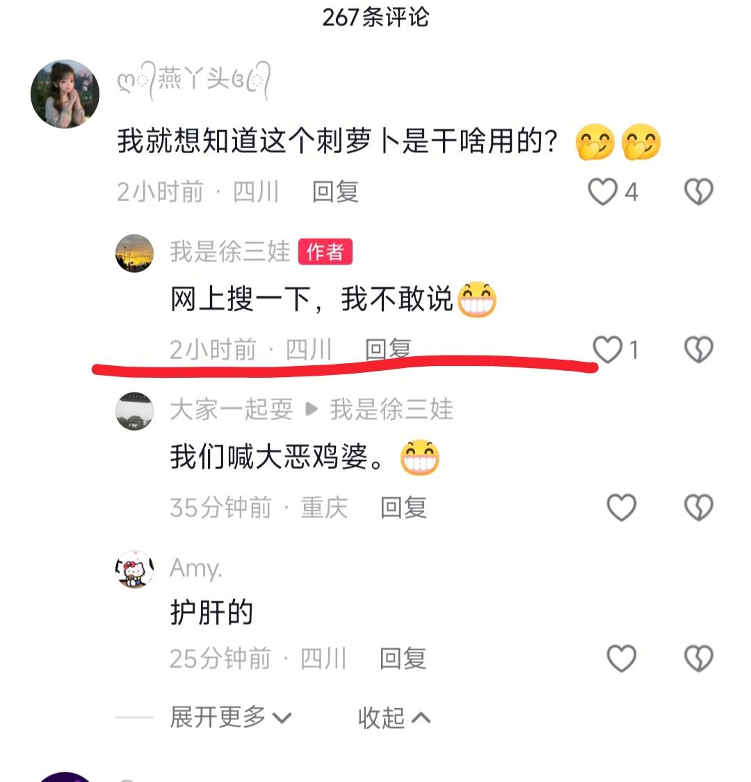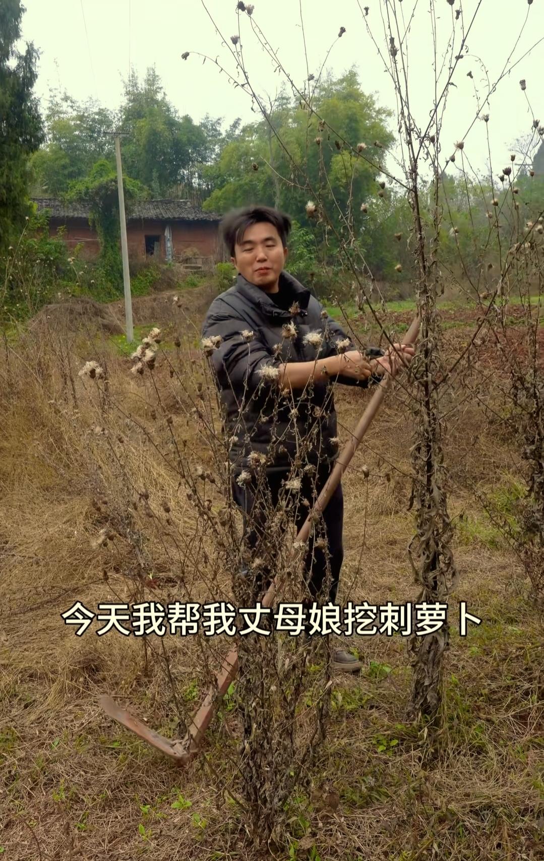 看到徐三娃帮丈母娘挖刺萝卜,我忍了 看到看到他一脸正经的介绍吃萝卜的样子学名,我也忍了 可是看到为了挖刺萝卜,搞得自己四脚朝天我实在忍不住了 刷到徐三娃帮丈母娘挖刺萝卜的视频,我直接笑喷,这大哥挖个野菜都能整出大戏,关键还赚得盆满钵满,不是吧?这操作也太秀了!说实话,我一开始还以为刺萝卜是啥稀罕玩意儿,听完他科普才知道,原来就是学名大蓟的中草药,他还不敢说效果,主打一个谨慎。 徐三娃扛着锄头直奔一棵树旁,指着植物就开始唠,说这东西叫刺萝卜,根像萝卜还带刺,名字就这么来的。本来想一锄头挖出个完美萝卜根,结果第一株挖出来歪歪扭扭,压根不像,我晕,这开局有点拉胯。他没气馁接着挖,后面的根终于细长像样,丈母娘也加入队伍,俩人咔咔挖,没多久就装满两筐。然后高能来了,他用力过猛直接四脚朝天摔地上,我和小伙伴都惊呆了!想起我上次挖蒲公英,认错品种挖了一堆野草,白忙活半天,郁闷到想撞墙。 徐三娃