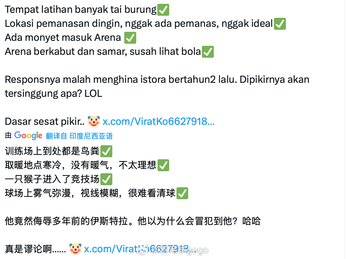 🎤印尼记者总结的2026年印度羽毛球公开赛 1.训练场上到处都是鸟粪2.没有暖气3.一只猴子进入体育馆4.球场上雾气弥漫,视线模糊,很难看清球