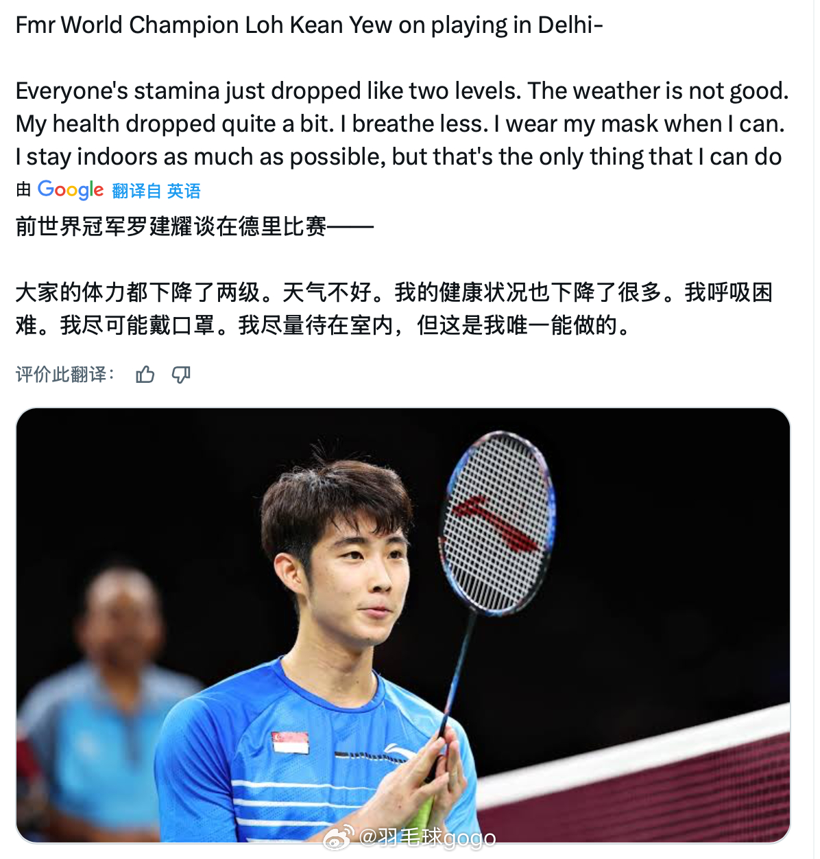🇸🇬骆建佑直言在🇮🇳参加2026年印度羽毛球公开赛 :健康状况下降很多,尽可能戴口罩。