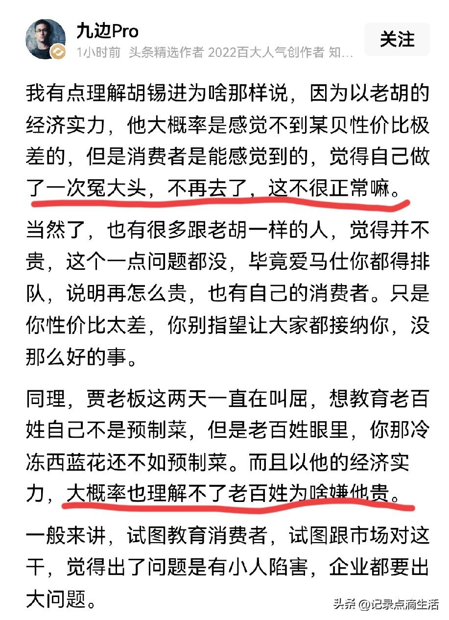 九边Pro评论某贝关店这事,还是比较中肯的,说白了还是消费层级的问题,那些有钱人永远理解不了老百姓为什么不食糜肉,而老百姓无法想象那些有钱人整天都是怎么吃饭的。 有人为了买一颗白菜都要讨价还价半天,而有的人豪车豪宅买的时候都不带眨眼。 罗永浩只是把问题加速暴露出来而已,在这个信息时代,就算罗永浩不说,还有可能让张永浩、马永浩去发表自己的感受。 还有胡锡进也是,他拿的高额的退休金,一个月的退休金可能是一些家庭一年的全部收入都不止。他当然无法理解普通工薪阶层说的贵了。 就好比你口袋里有10000块,让你买一个10块钱的东西,你觉得没什么感觉,如果换成你只有20块钱,再买这个东西又是什么感觉。 说白了老胡就是有点朱门酒肉臭,路有冻死骨的味道了,他们一家在某贝吃一餐,很有可能是普通家庭一个月的伙食费。 当然消费高低还不是主要矛盾,普通消费者在这次事件中,感觉受到了消费欺骗,感觉自己花这个钱没有享受到应有的服务。 另外贾老板和很多倒闭的企业老板一样,都是觉得问题出在别人身上,都是别人在搞自己,身边的小人太多了。 从来没想过自己的问题,也从来不认为自己有问题,这样的企业能够做大做强,也纯靠时代红利和运气好罢了!